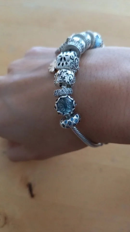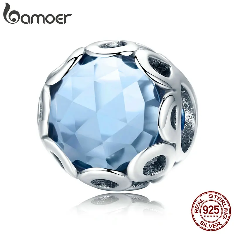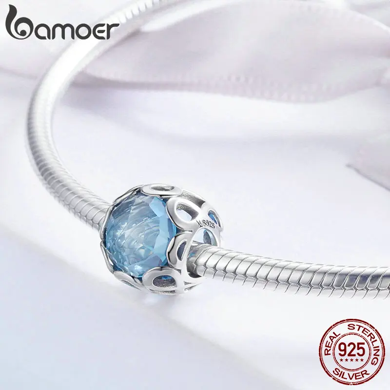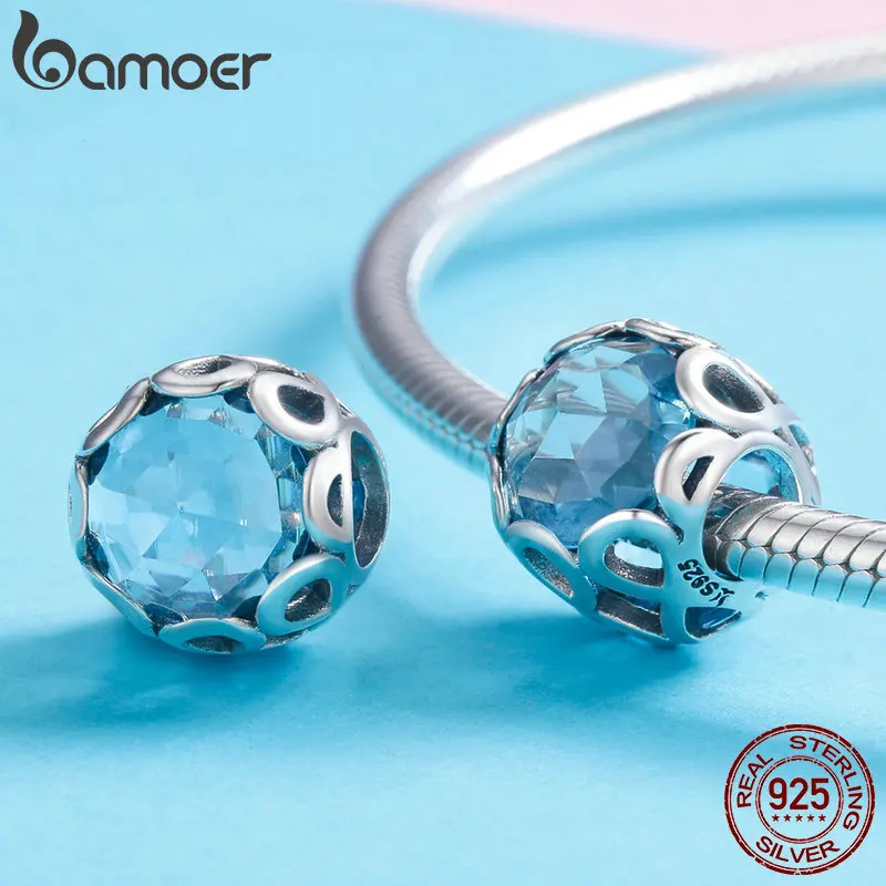 BAMOER круглые бусины из стерлингового серебра 925 пробы с фианитами синего цвета, очаровательные браслеты, изготовление ювелирных ожерелий SCC755
