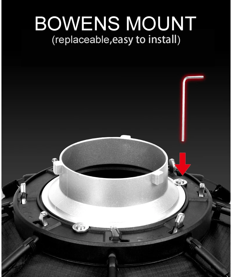 1. Внутри с отражающим серебром и поставляется с передним полупрозрачным диффузором, отлично подходит для speedlite, monolight, strobe или slave.