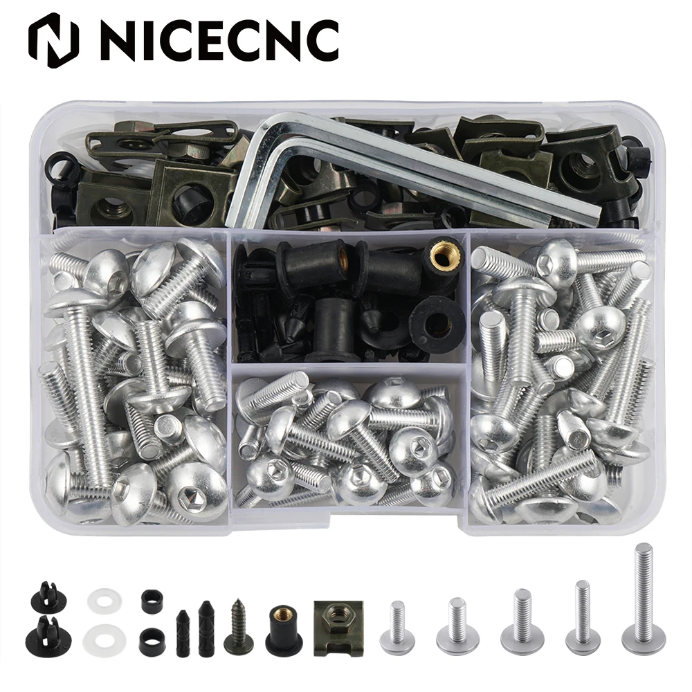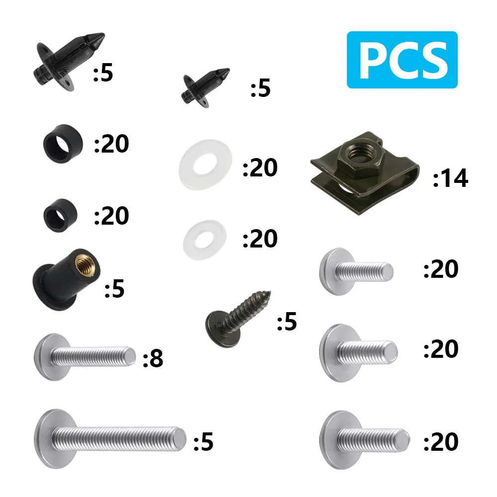 Посылка включает в себя: (с пластиковой коробкой)(* 74 болта и 116 аксессуаров) 190 штБолты M6- (6x40 мм) x 6 шт.Болты M6- (6x16 мм) x 20 шт.Болты M6- (6x20 мм) x 20 шт.Болты M5- (5x16 мм) x 20 шт.Болты M5- (5x25 мм) x 8 шт.Зажимы скорости x 14Крепежные винты x 5Гайка колодца х 5Нейлоновые шайбы для 6 мм x20Нейлоновые шайбы для 5 мм x20M6 пластиковая стойка x 20M5 пластиковая стойка x 20Обтекатели: M6x5, M8x5Шестигранный ключ: M5x1 M6x1