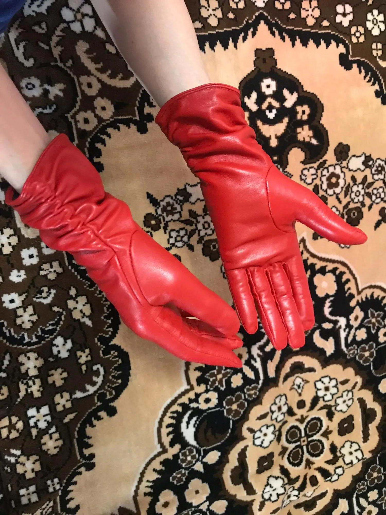 перчатки длинные, пахнут кожей, на холодную осень