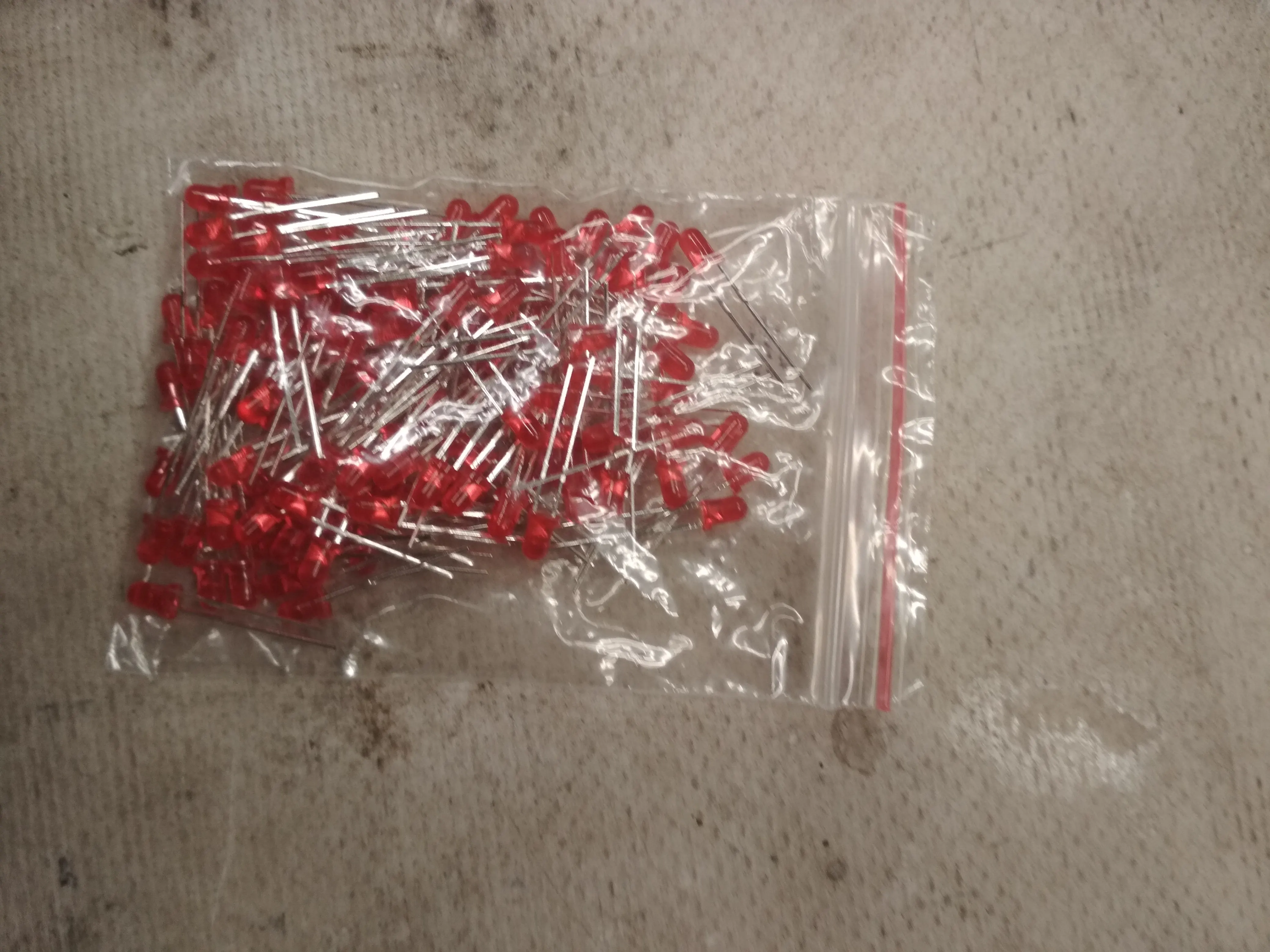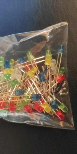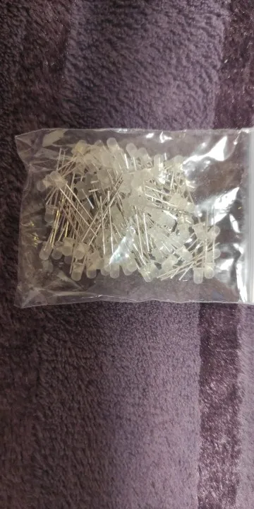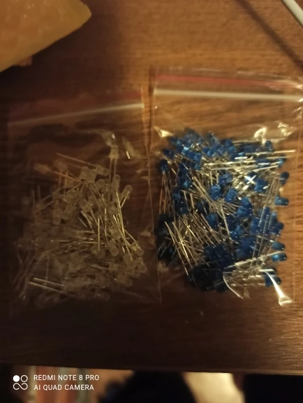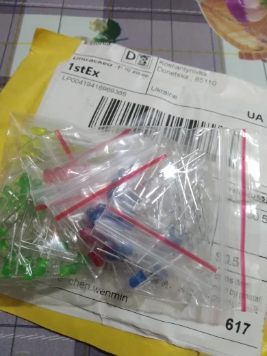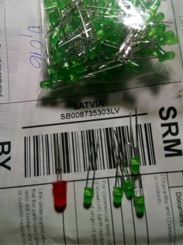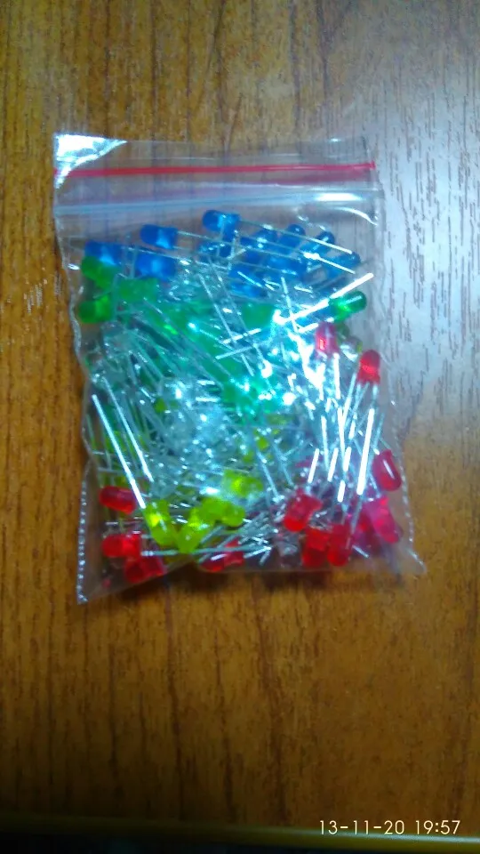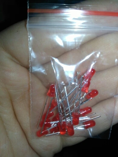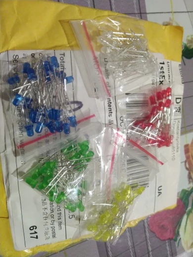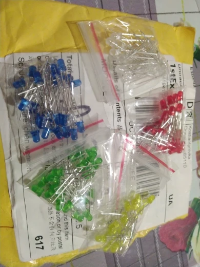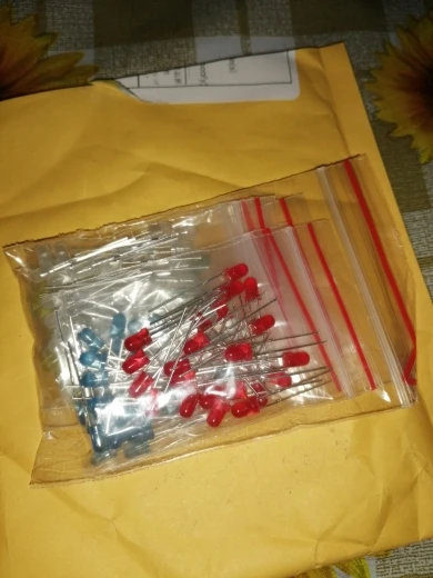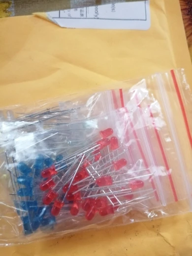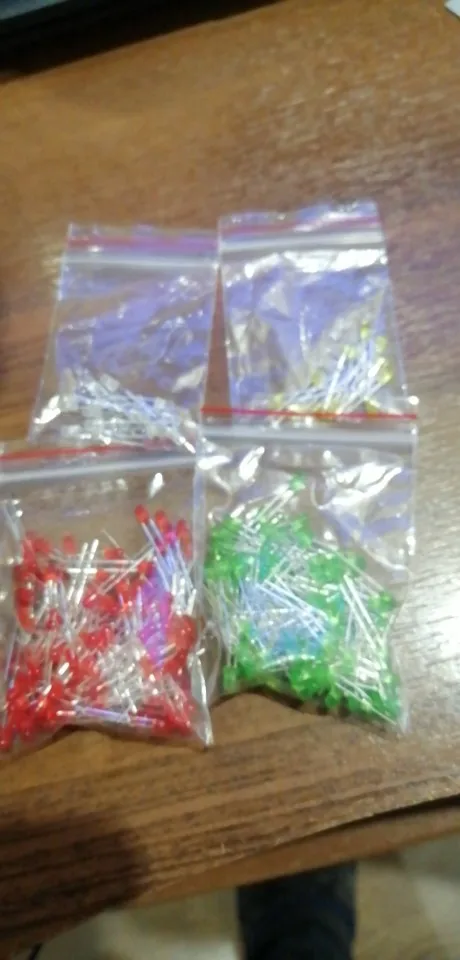 Дошло за 2 месяца до Тюмени. Заказывал 5 цветов по 20 шт. Точное количество не пересчитывал, но плюс минус где-то так оно и есть. Огорчило то, что не все светодиоды сверхъяркие. Синие, зелёные и белые яркие, имеют рабочее напряжение 2,6 - 2,7В. А вот красные и жёлтые обычные светодиоды и имеют рабочее напряжение 1,9В, и соответственно светят неярко.
