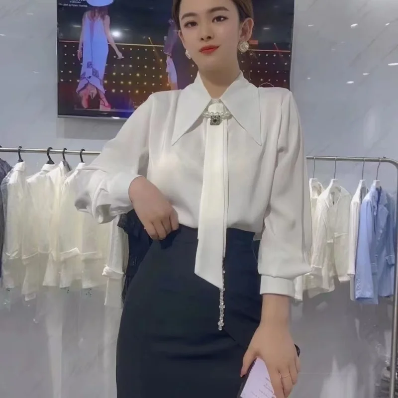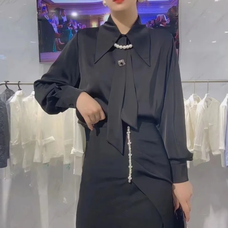 Блузка Женская атласная с длинным рукавом, модный топ свободного кроя с завязкой, с круглым воротником, модная одежда для офиса, весна 18581