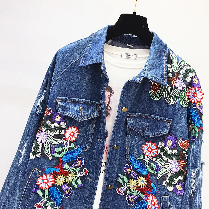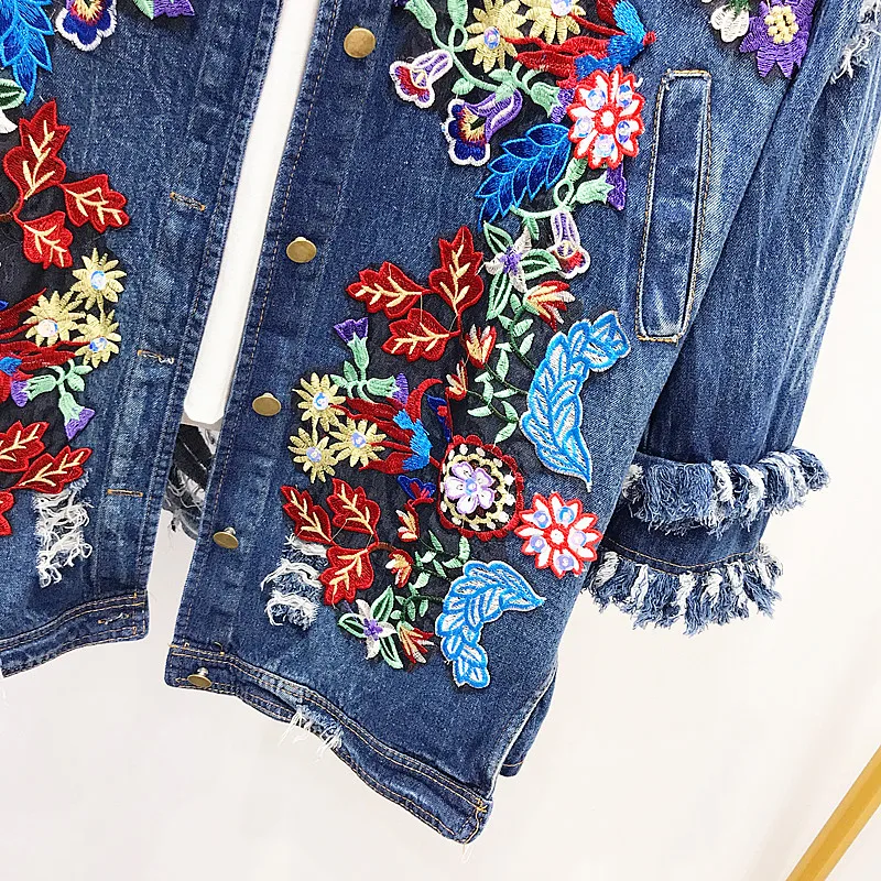 Куртка-бомбер ручной работы из денима с бисером, Свободный длинный кардиган с 3D бисером и дырками, Цветочная вышивка пайетками