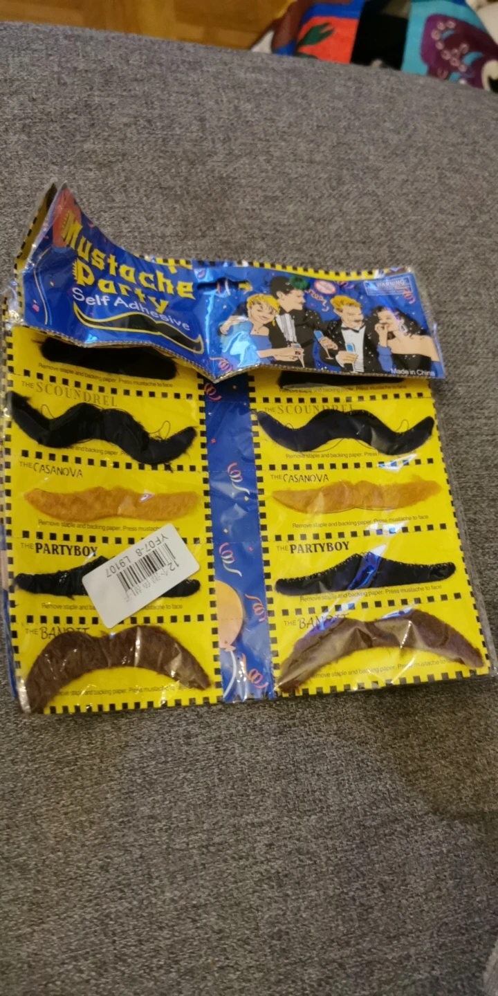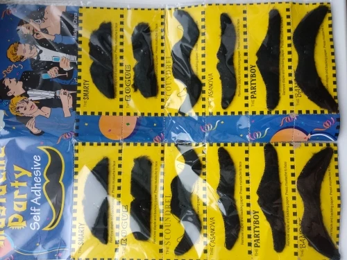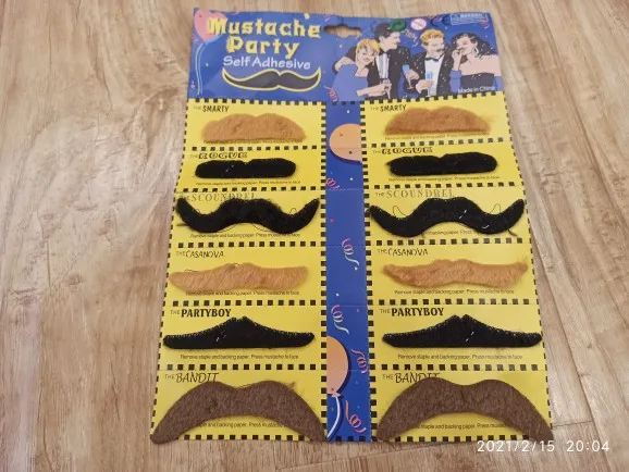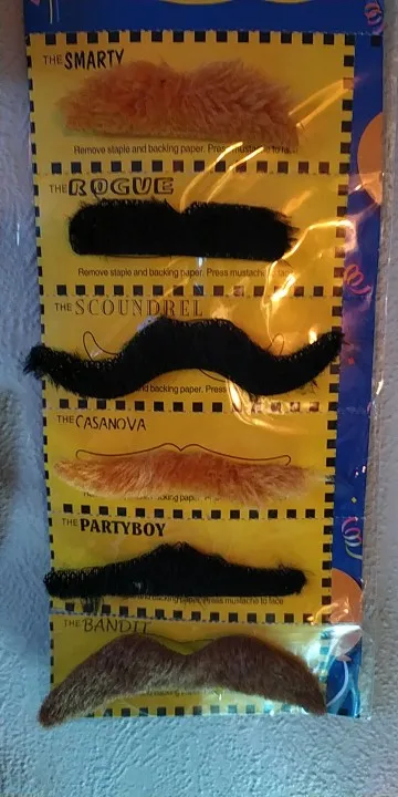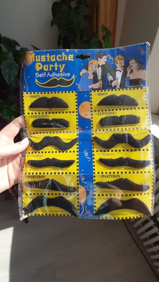 Прикольные усы. Поржали и дома, и коллеги на работе. Сложно только отлепить бумажку, котор ая защищает липкий слой. Их можно приклеивать много раз (я уже одни раз десять приклеивал). Главное, после того как с себя снял прилепить их клеящим слоем на картонку.
