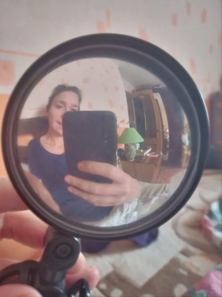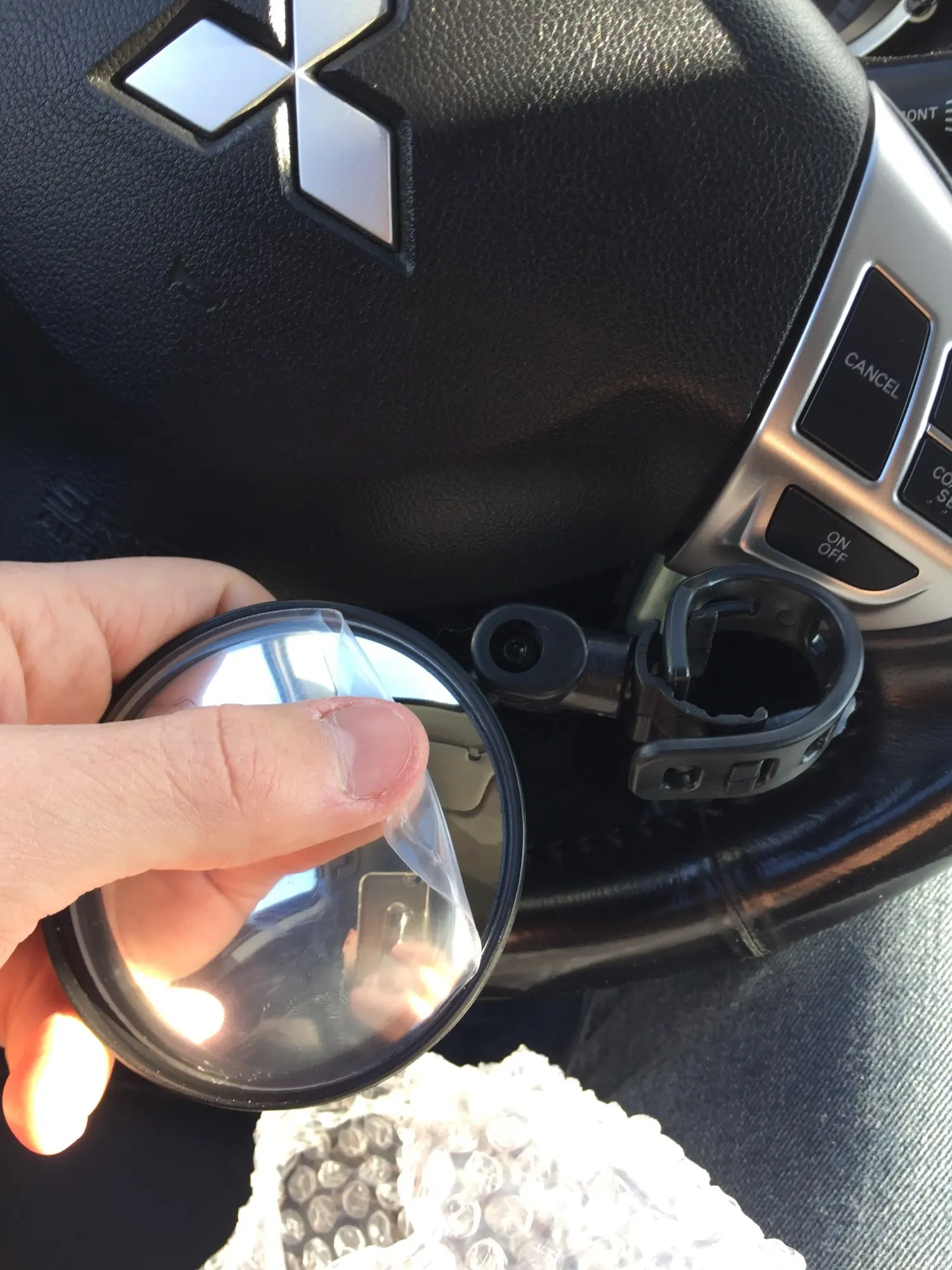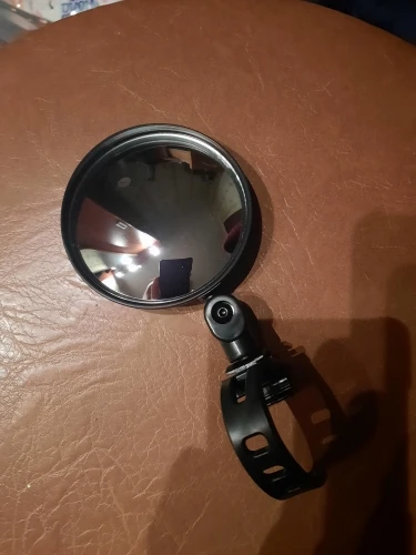 Нормальное зеркало. Обзор широкий. Диаметр у него 8 см. Крепление конечно очень ненадежное, будет улетать на кочках, для подстраховки хомутом еще затянул. Пленку защитную кое как снял иголкой.
