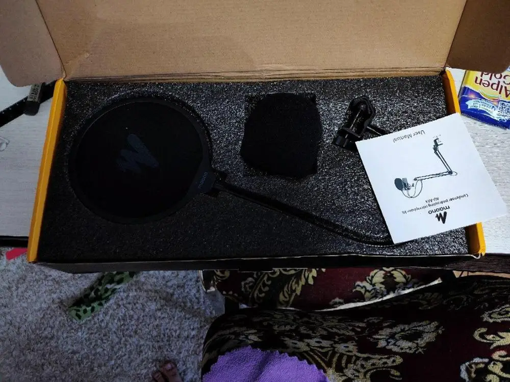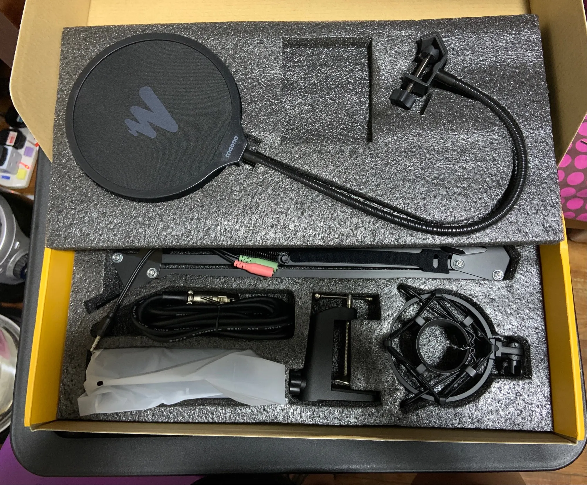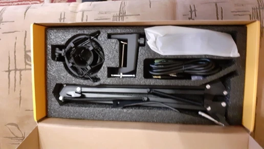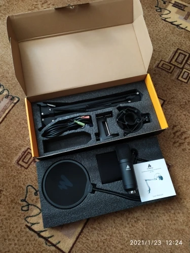 Микрофон пришёл, всё хорошо, но коробка помята, а так всё на месте. Микрофон неплохой, но внешней звуковухи и/или фантомного питания ему не хватает. Поп фильтр и ветрозащита нормальные, но вот пантограф и держатель паук не очень хорошие. Оба держат достаточно посредственно. Если оценивать по отдельности Микрофон - 7/10 (если есть аудиокарта то 8/10) Ветрозащита - 6/10 (толком не влияет на звук) Поп фильтр - 6/10 (также как и с ветрозащитой) Пантограф - 5/10 (держит, но не более) Паук - 5/10 (держит плоховато, на счёт гошения вибраций хз, мб и гасит, я не заметил) В целом покупкой доволен