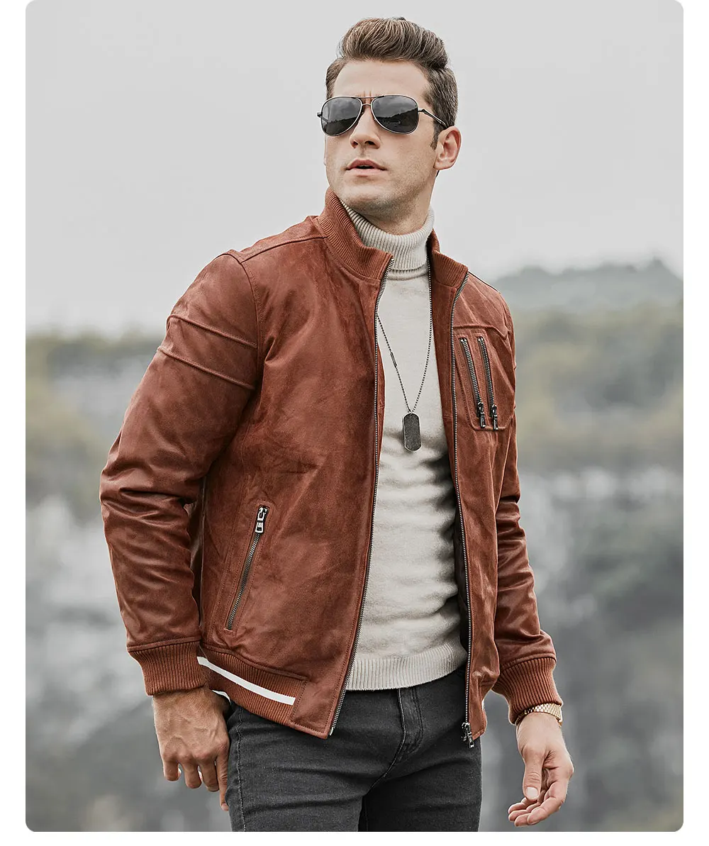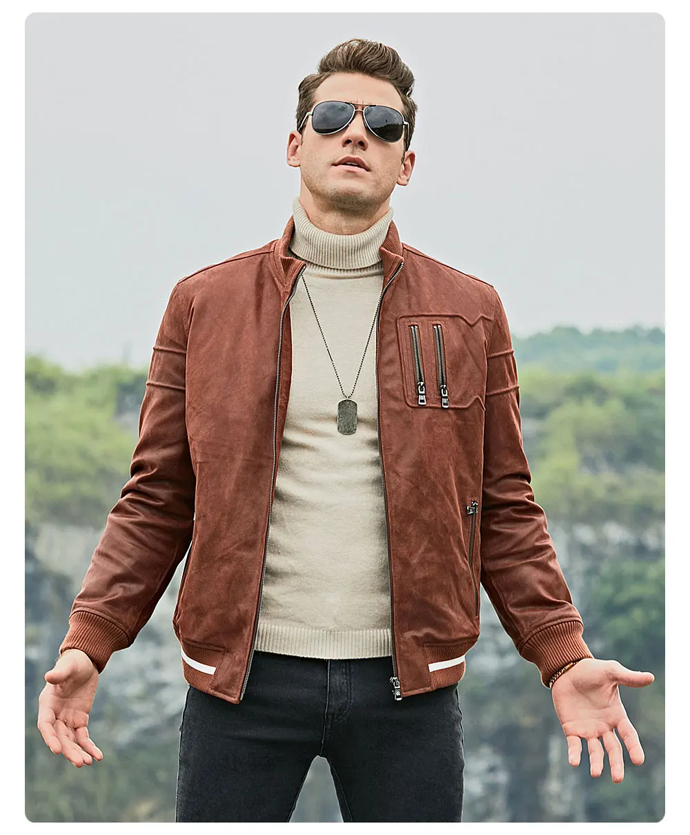 Мужская куртка из свиной шкуры FLAVOR, облегающее пальто из натуральной кожи со стоячим воротником и манжетами в рубчик