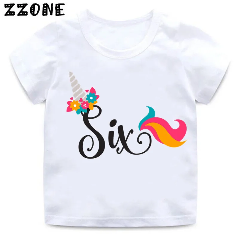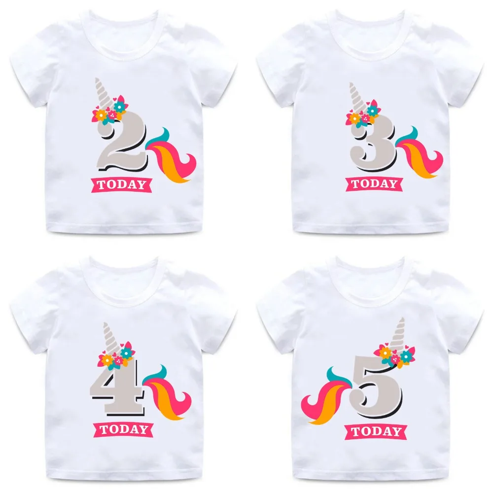 Футболка с милым принтом единорога для девочек на день рождения, номер 1-9, Детская летняя белая футболка, Детская забавная одежда для подарка на день рождения, HKP2431