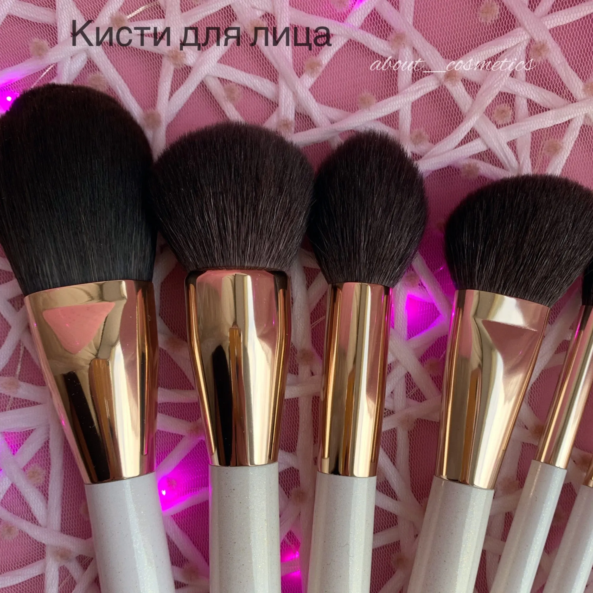 Набор понравился! Отличная для бровей, тоненькая. Из синтетики мелкая тонкая для стрелок супер. Из пушистых для глаз, одна бочонок, большой диаметр, это редкость, такую отдельно не найти. Для тушевки в дымку супер. Две другие тоже хорошие более плоские, одна чуть меньше. Из пони маленькие мягкие, одна жестковата, а вторая мягкая, что тоже редкость. Для лица понравилась кисть факел, супер для всех сухих текстур и скошенная отличная, обе натуральные. Для пудры большая очень мягкая, ей супер тонким слоем фиусировать рассып.пудрой тон, но она синтетика. Общее впечатление - отлично! Рекомендую, и для себя и для работы. Продавец угощает подарочками