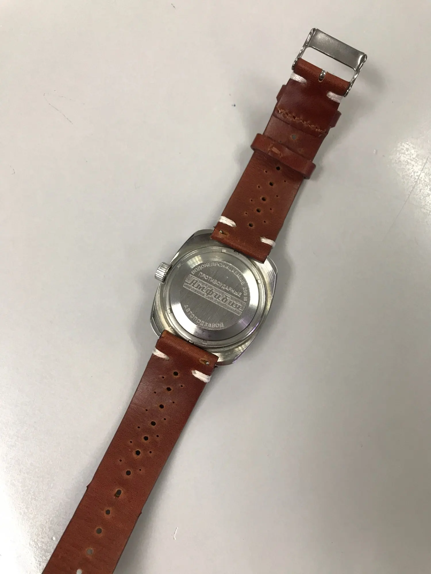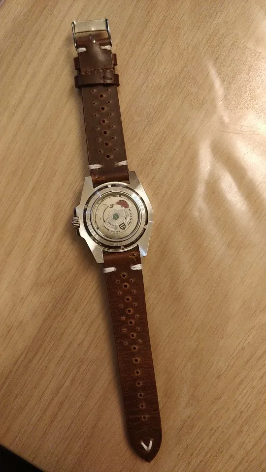 Ремешок превосходного качества, хорошая выделка с обеих сторон, пахнет кожей. Дошел за 12 дней. Из недостатков - толстый (в два с лишним раза толще такого же советского ремешка) и жёсткий, может быть разомнется со временем. тоненькие проушины, но зато легкосьемные. При этом выглядит дорого, и качество - выше стоимости. На советские часы с ушками 18 мм подходит идеально.