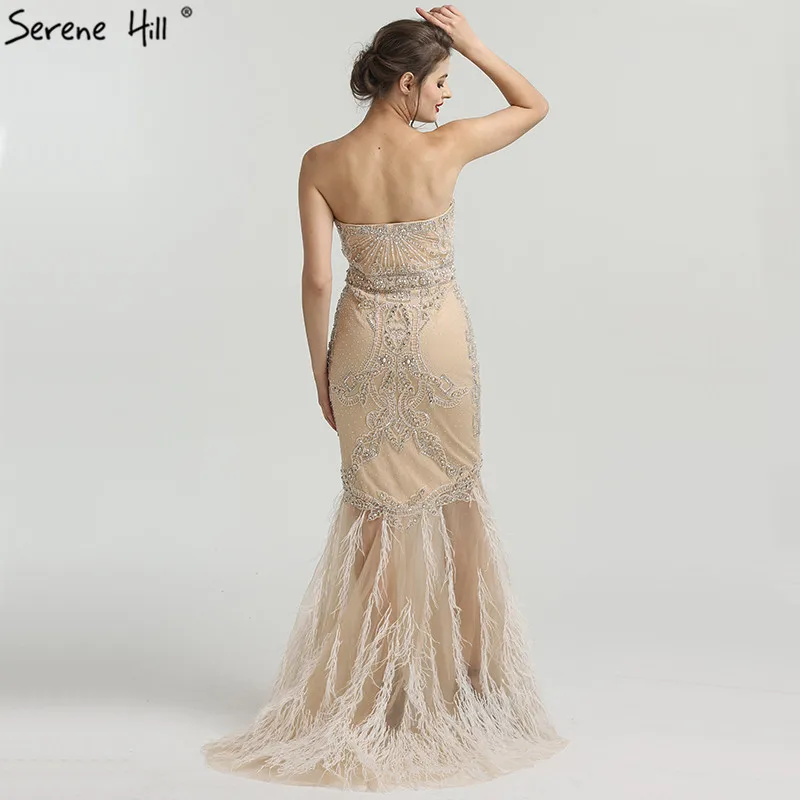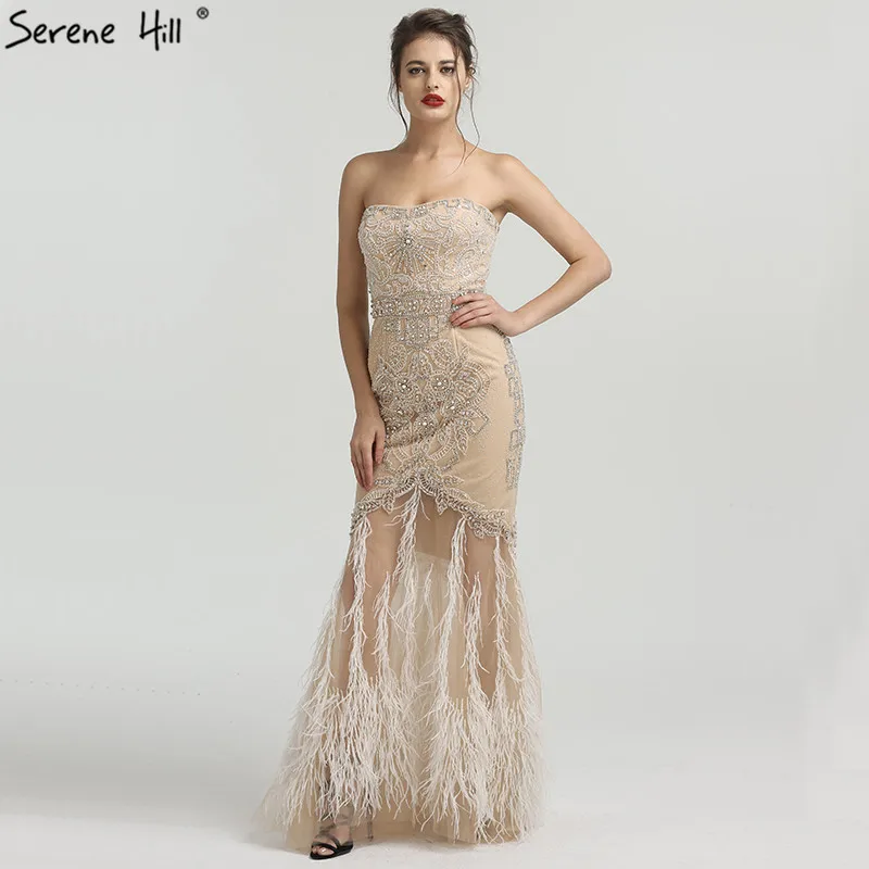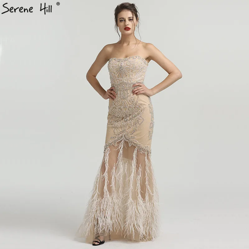 Золотое сексуальное вечернее платье без бретелек с перьями русалки, модное вечернее платье из тюля со стразами и бисером, 2021 Serene Hill LA6588