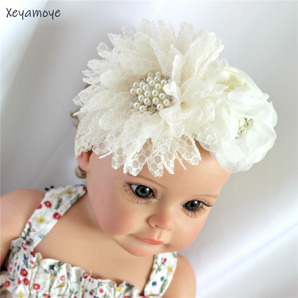 Детские аксессуары для волос для новорожденных, жемчужные цветы с кружевом, широкие повязки на голову, аксессуары для волос Phoro, реквизит, детский тюрбан