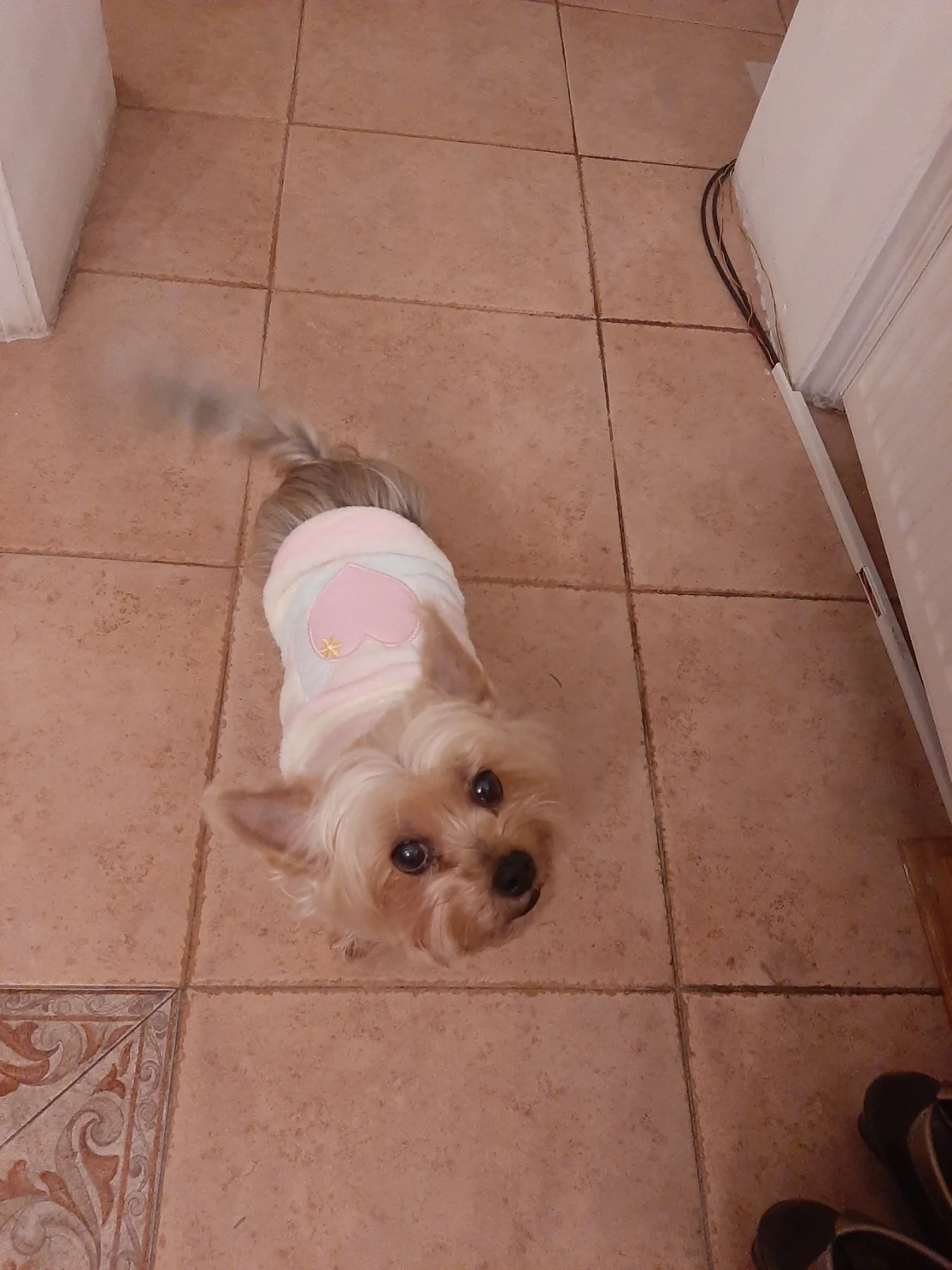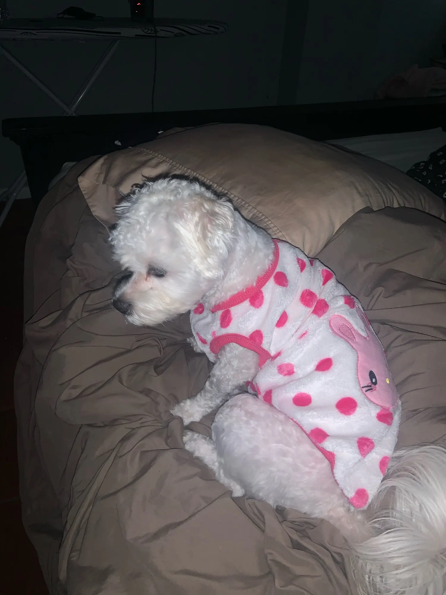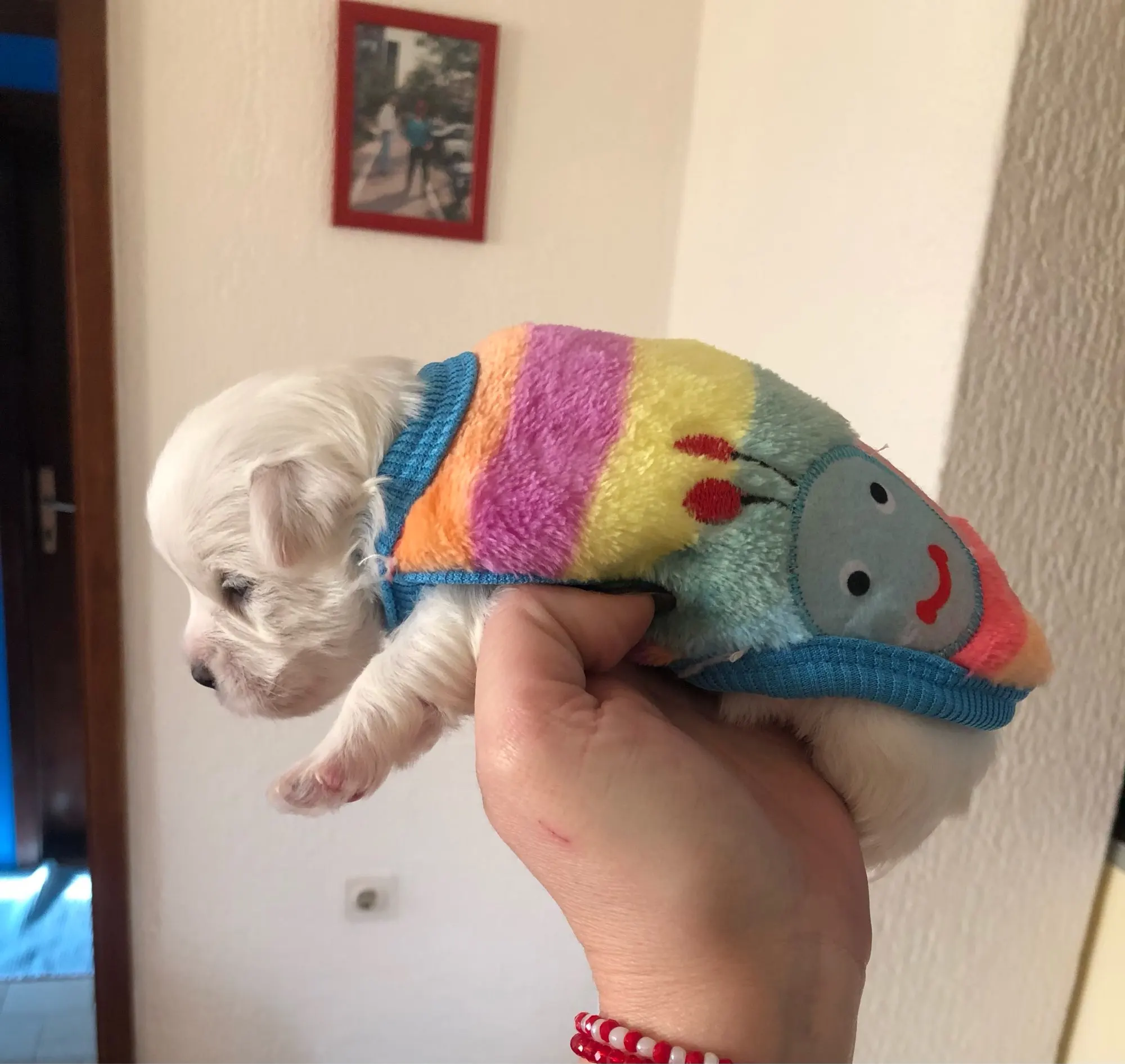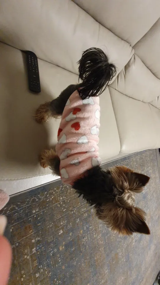 Я не знаю, выбрал ли я неправильный размер, он маленький, или это то, что мой Пинчер быстро растет ..... Но эй, как пижама, это работает для меня .... Он остается на полталии...