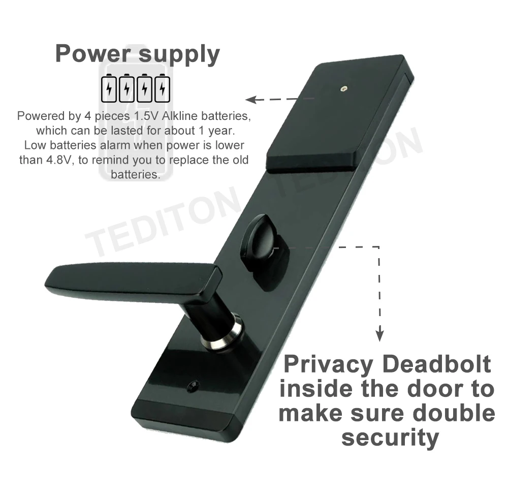 1. Разблокировка с кодом доступа и картами. Поддерживает максимум 1 мастер-карту, 200 пользовательских карт максимум 1 мастер-код доступа, 50 пользовательских кодов доступа. 2. Универсальный для правого или левого направления и открывания 3. Вы можете ввести любой номер до или после правильного пароля (защитите от подглядывания) Постоянно вводит неправильный пароль 5 раз, клавиатура будет заблокирована 5 минут (больше безопасности) 4. Безопасная конструкция ручки для защиты любого разрыва и прохождения 300 тысяч испытаний времени. 5. Скрытая Механическая Замочная скважина В случае, если батареи мертвы, вы можете использовать ключ, чтобы открыть дверь. 6. Заглушка конфиденциальности внутри двери, чтобы обеспечить двойную безопасность. 7. Приведенный в действие 4 шт. 1,5 V Alkline аккумулятор и зарядное устройство, которое может быть длится около 1 год. Там будет низкие батареи сигнализации в тех случаях, когда батареи ниже, чем 4,8 V, для того, чтобы устройство напомнит вам о необходимости замены старых батарей.