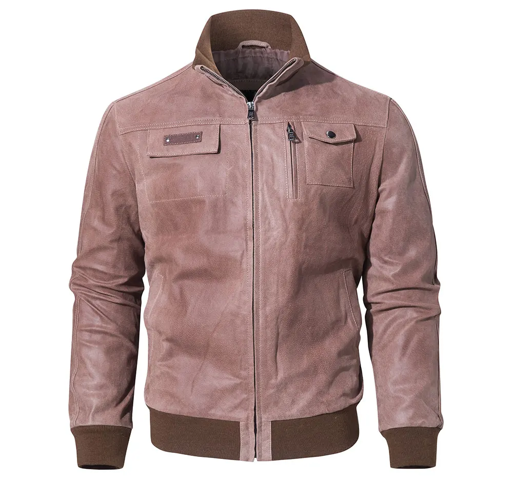 Kожаная куртка мужская мотоциклетный FLAVOR, со стоячим воротом, байкерская куртка из натуральной кожи с ребристыми манжетами и воротником