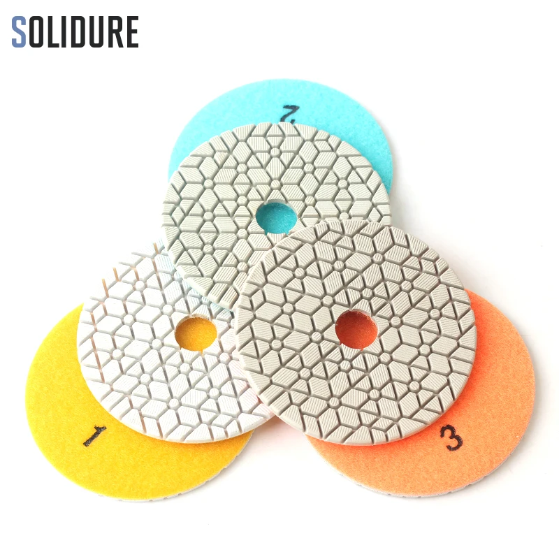 4 дюйма 100 мм алмаз влажные 3 шаг полирующие коврики комплект из босоножек ручной станок подходит используется для сухой полировки гранита, марльбе, engineeried камень и т. д. Мы порекомендовали 4500 об/мин, чтобы получить лучший результат полировки.