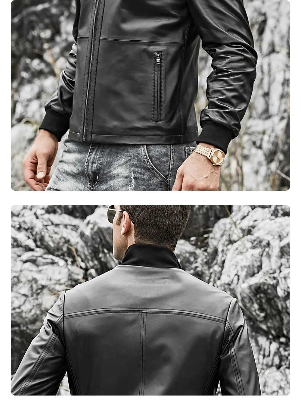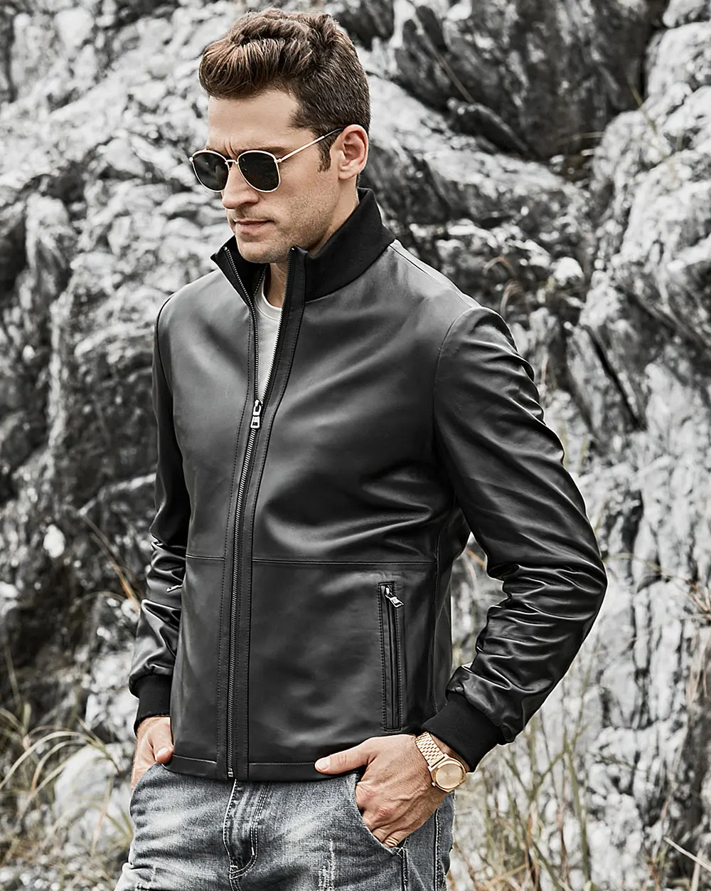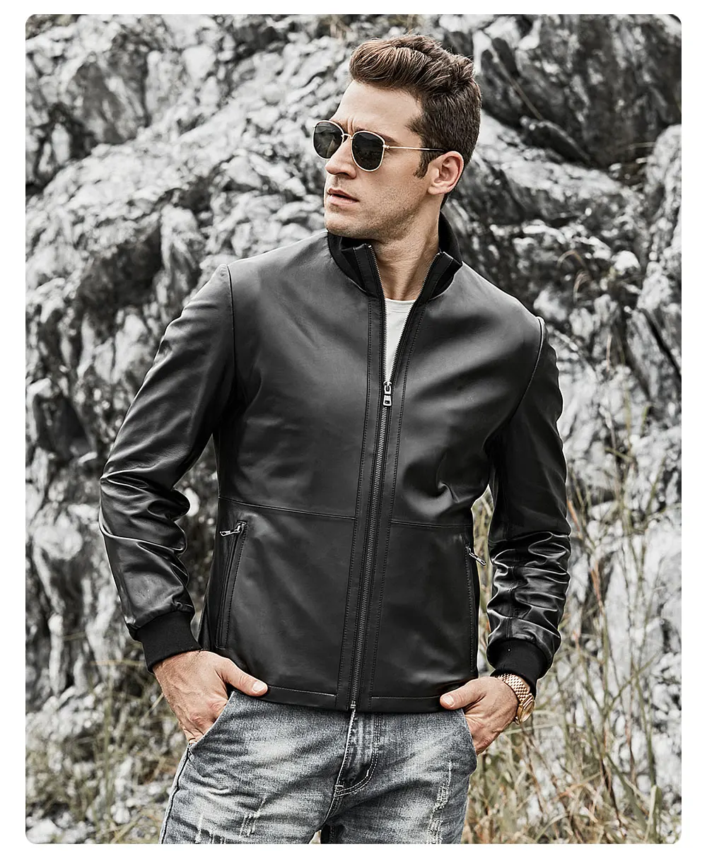 Мужской жакет из шкуры ягненка FLAVOR, мотоциклетный жакет из натуральной кожи со стоячим воротником и манжетами