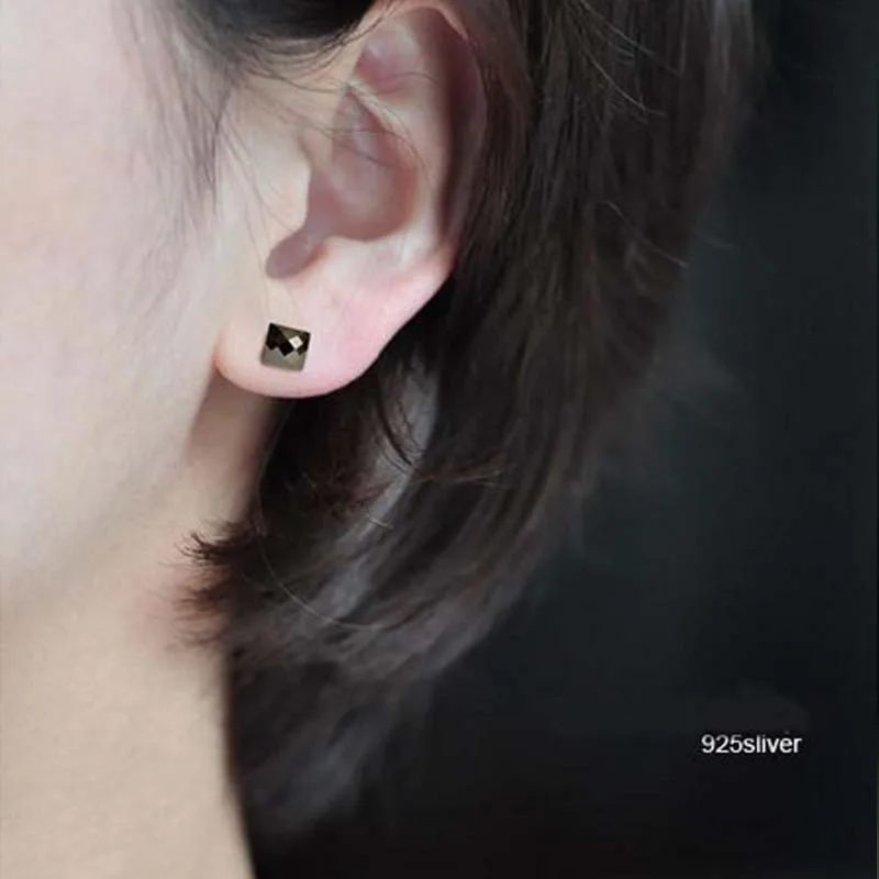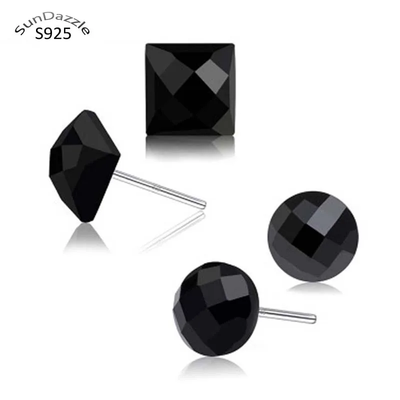 Серьги-гвоздики из настоящего чистого серебра 925 пробы для мужчин и женщин, ювелирное изделие с черными квадратными круглыми камнями для мужчин и женщин