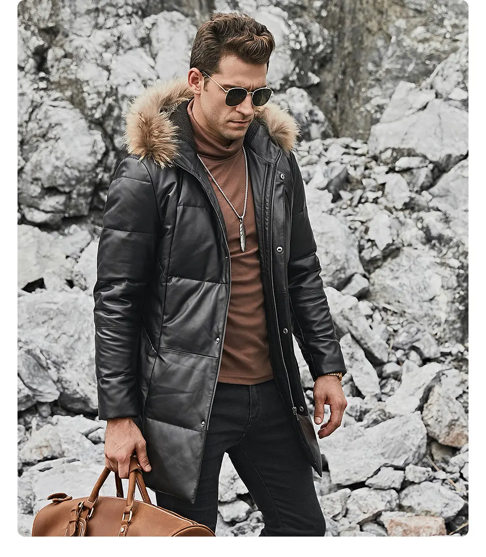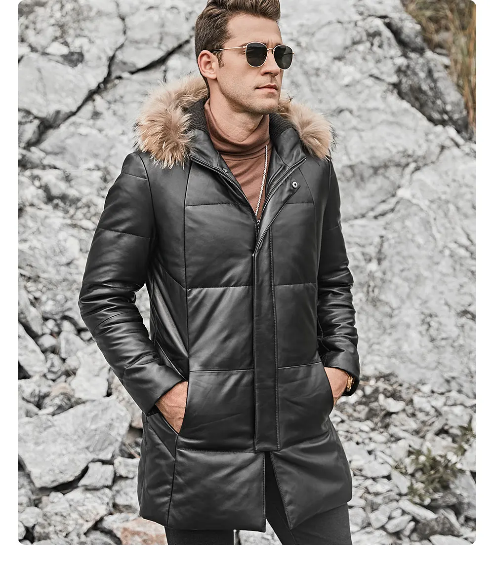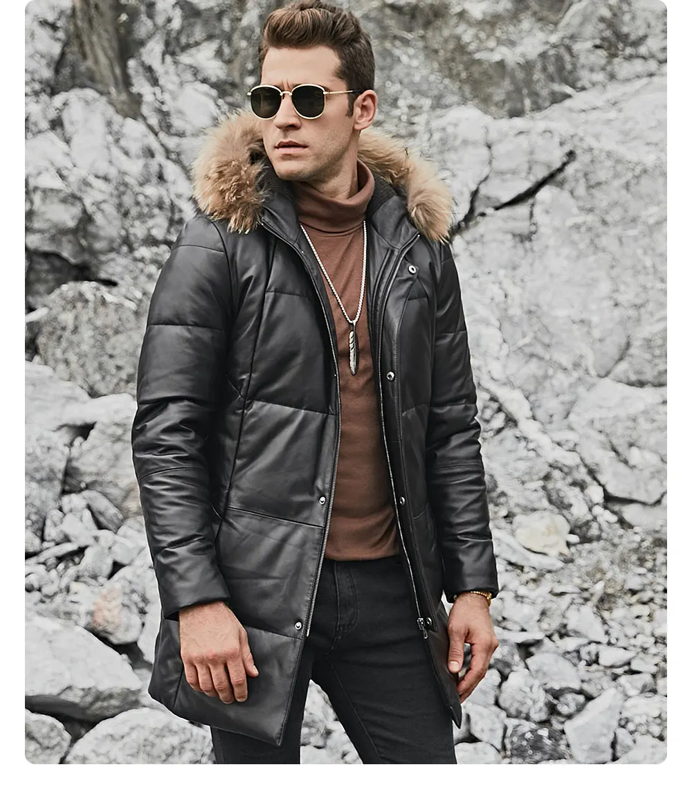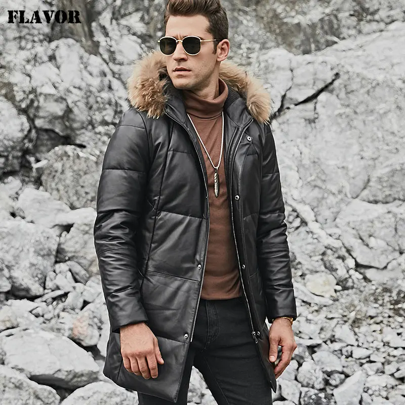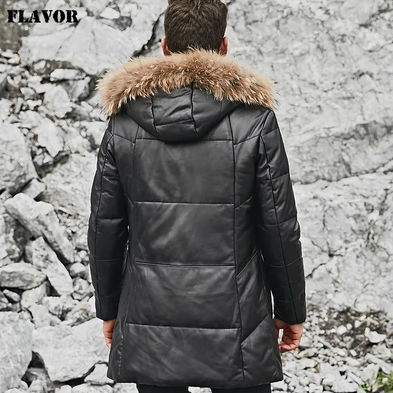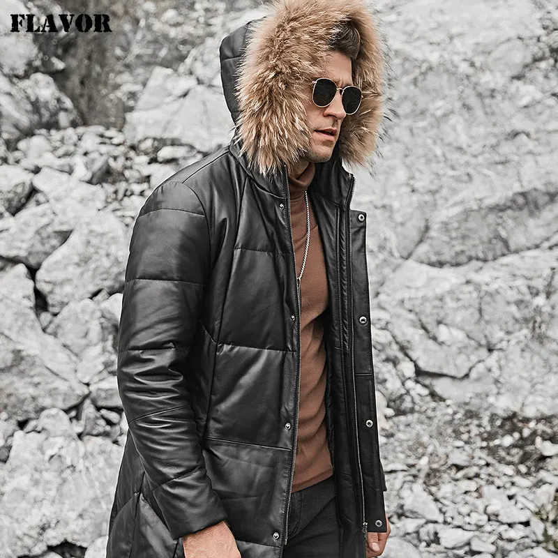 Kожаная куртка мужская пуховик из настоящей кожи ягненка FLAVOR, теплая куртка на белом утином пуху с капюшоном из меха енота, из натуральной кожи, для зимы