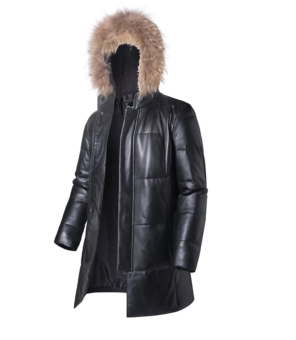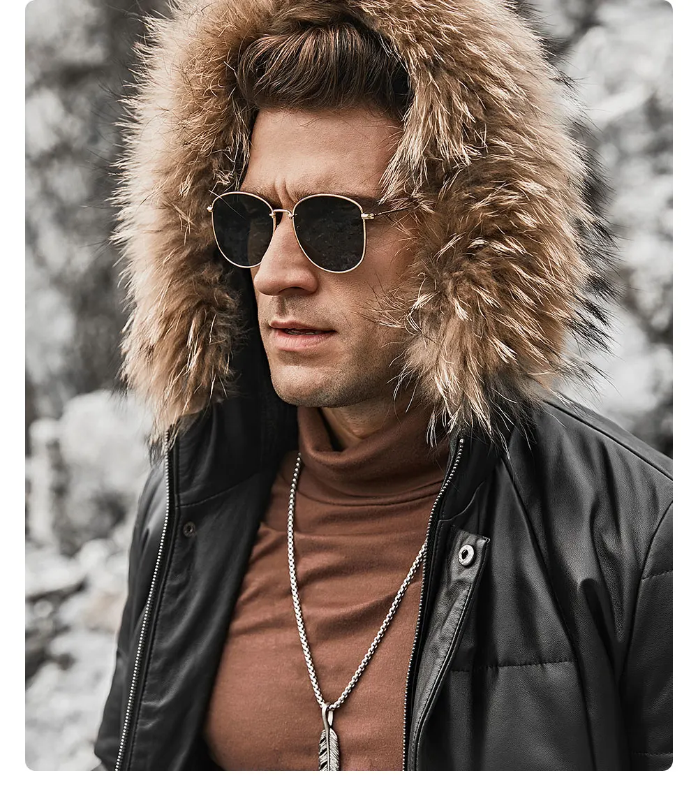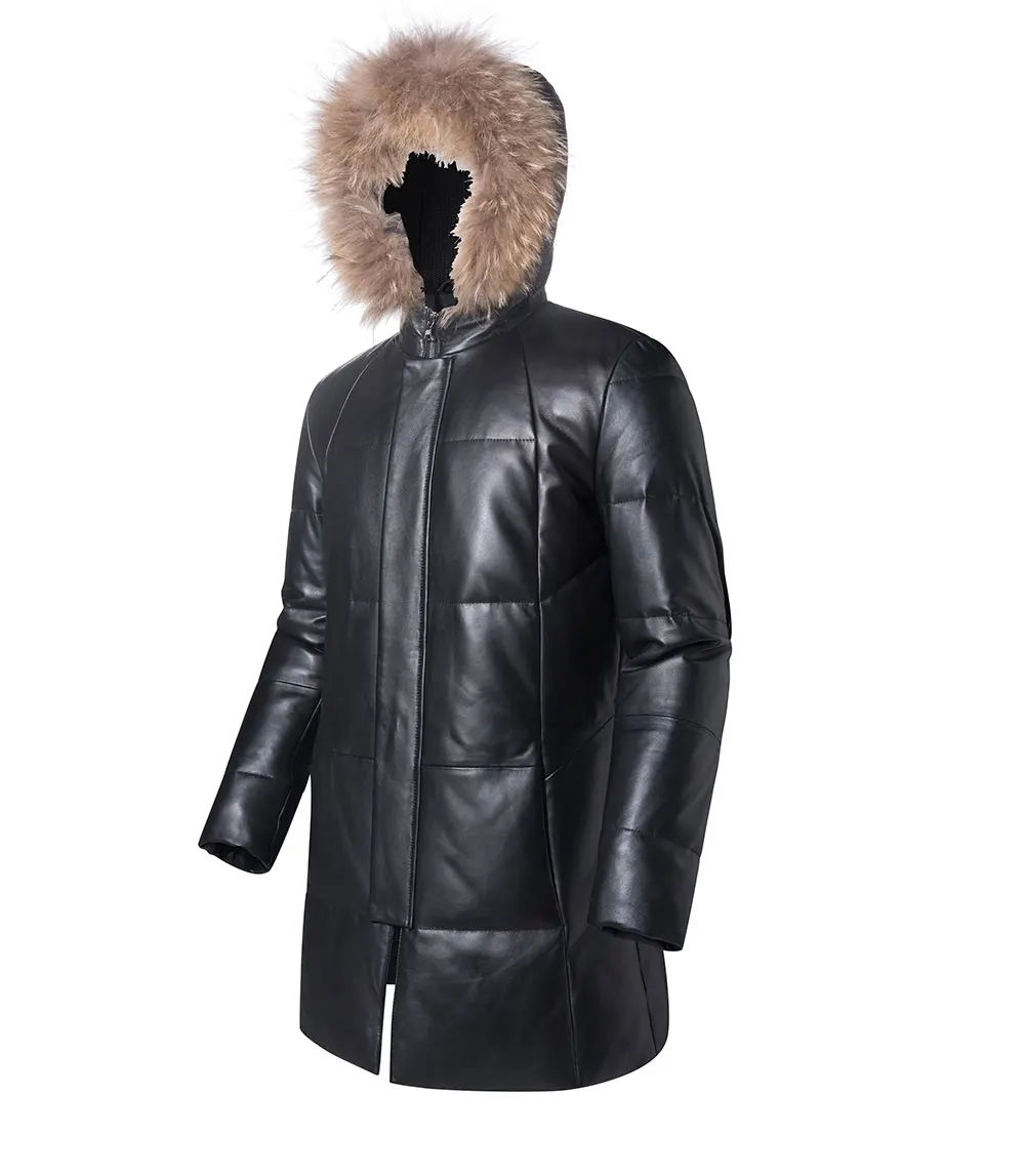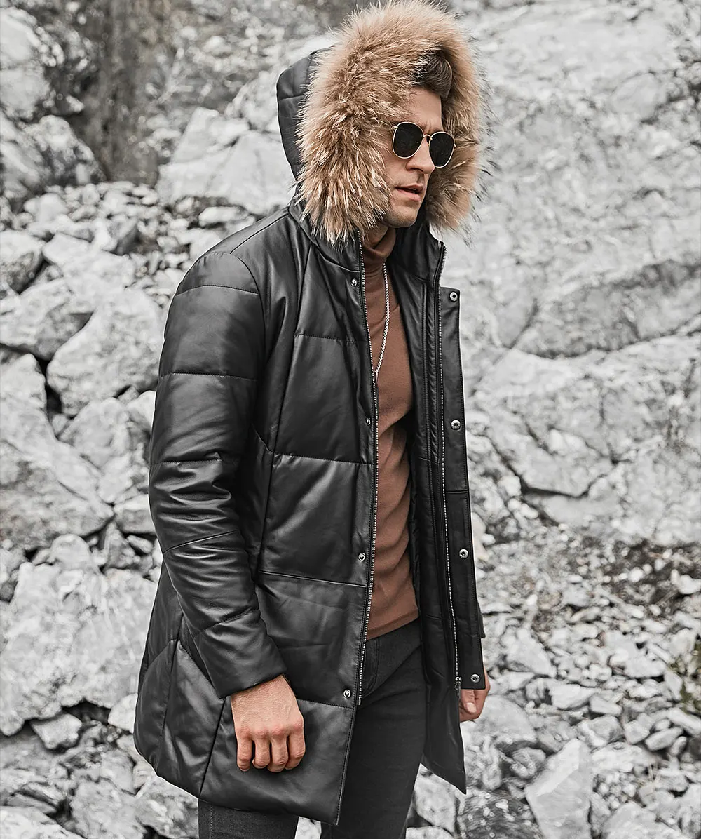 Kожаная куртка мужская пуховик из настоящей кожи ягненка FLAVOR, теплая куртка на белом утином пуху с капюшоном из меха енота, из натуральной кожи, для зимы