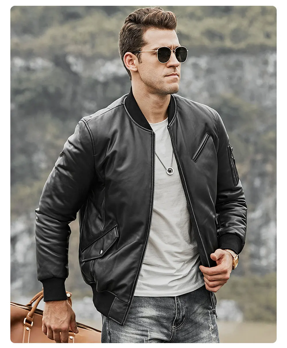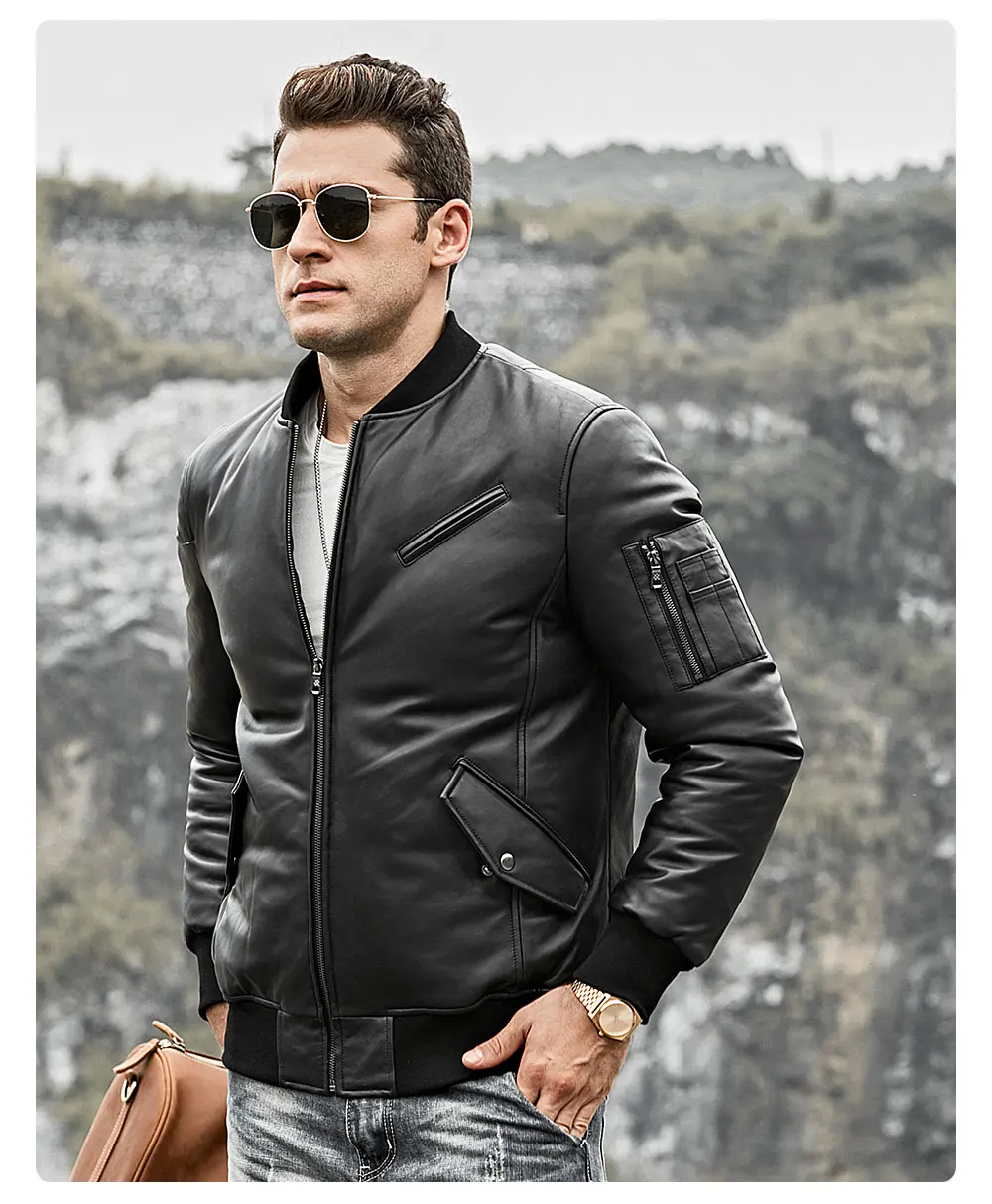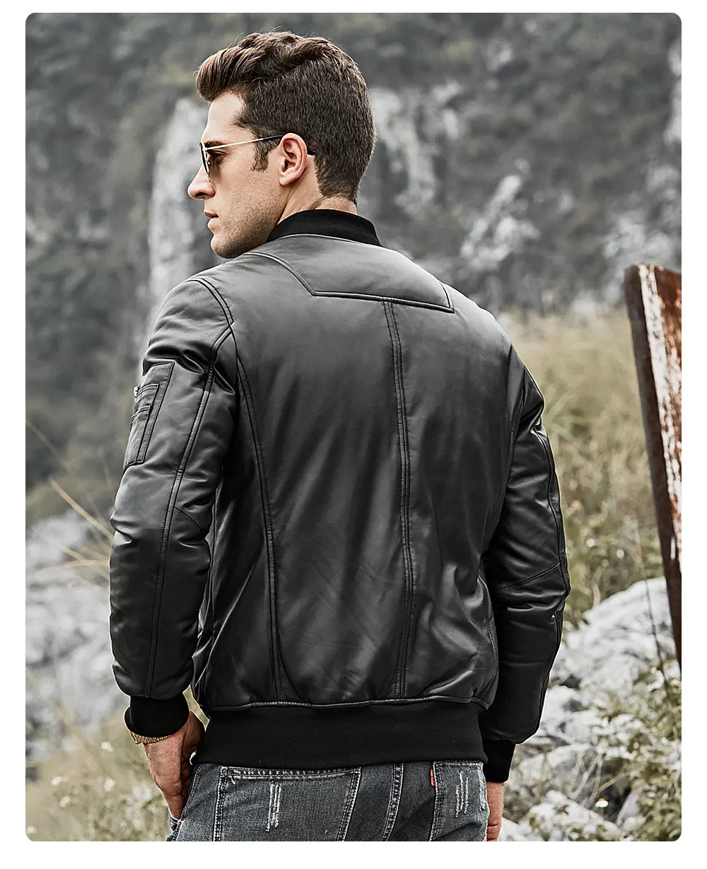 Мужской пуховик из натуральной кожи FLavor, бейсбольная куртка из натуральной кожи ягненка, теплое пальто на белом утином пуху