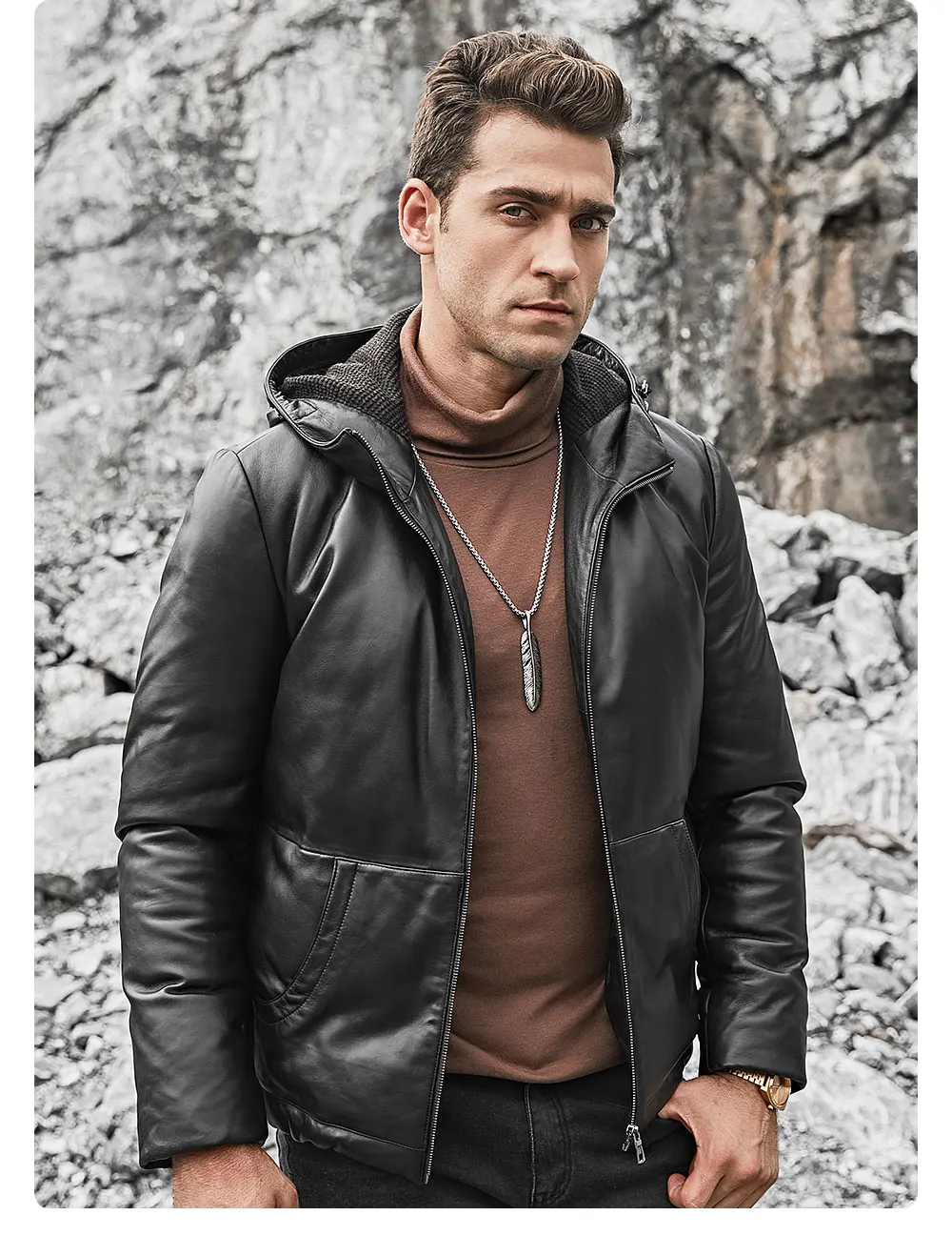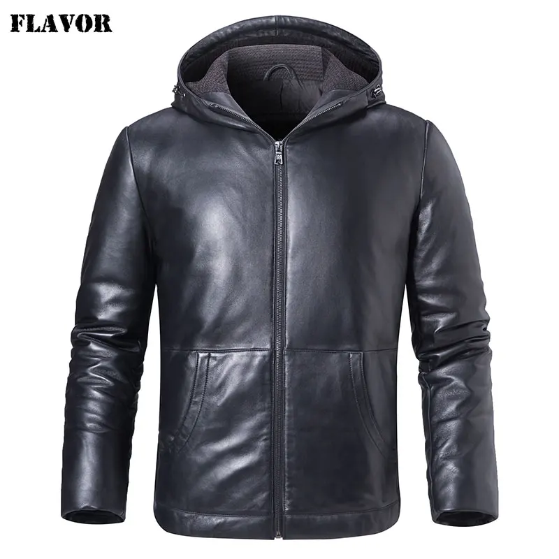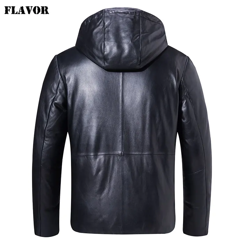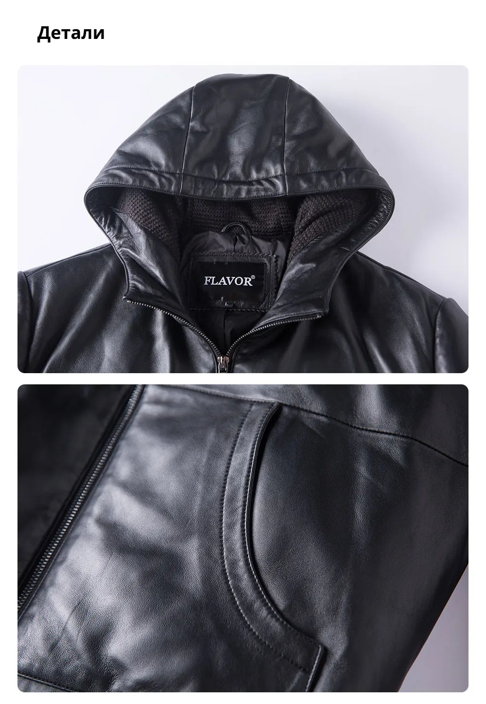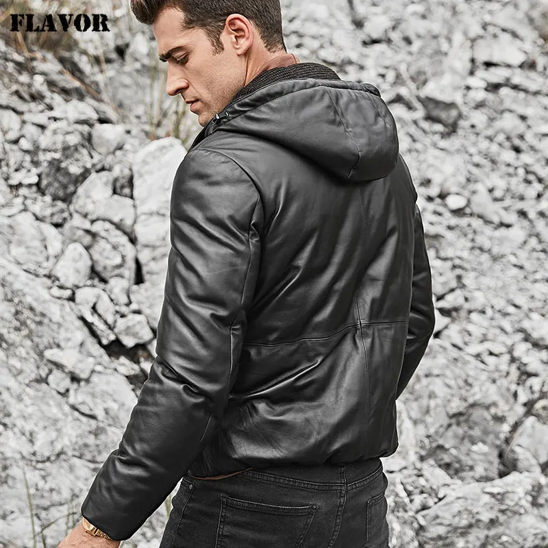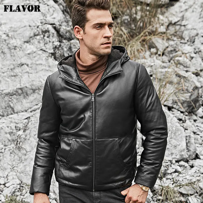 Kожаная куртка мужская толстовка на белом утином пуху FLAVOR, пуховик из натуральной шкуры ягненка, кожаное теплое пальто с капюшоном для зимы