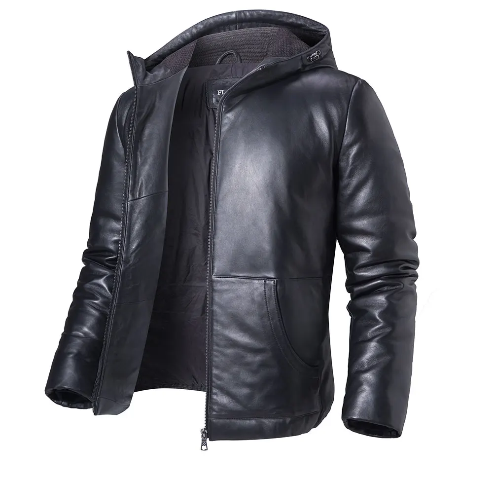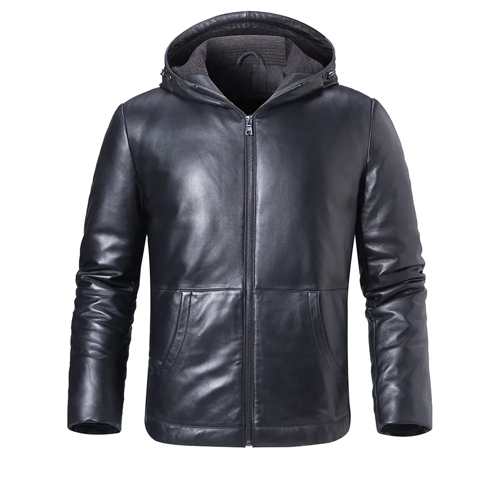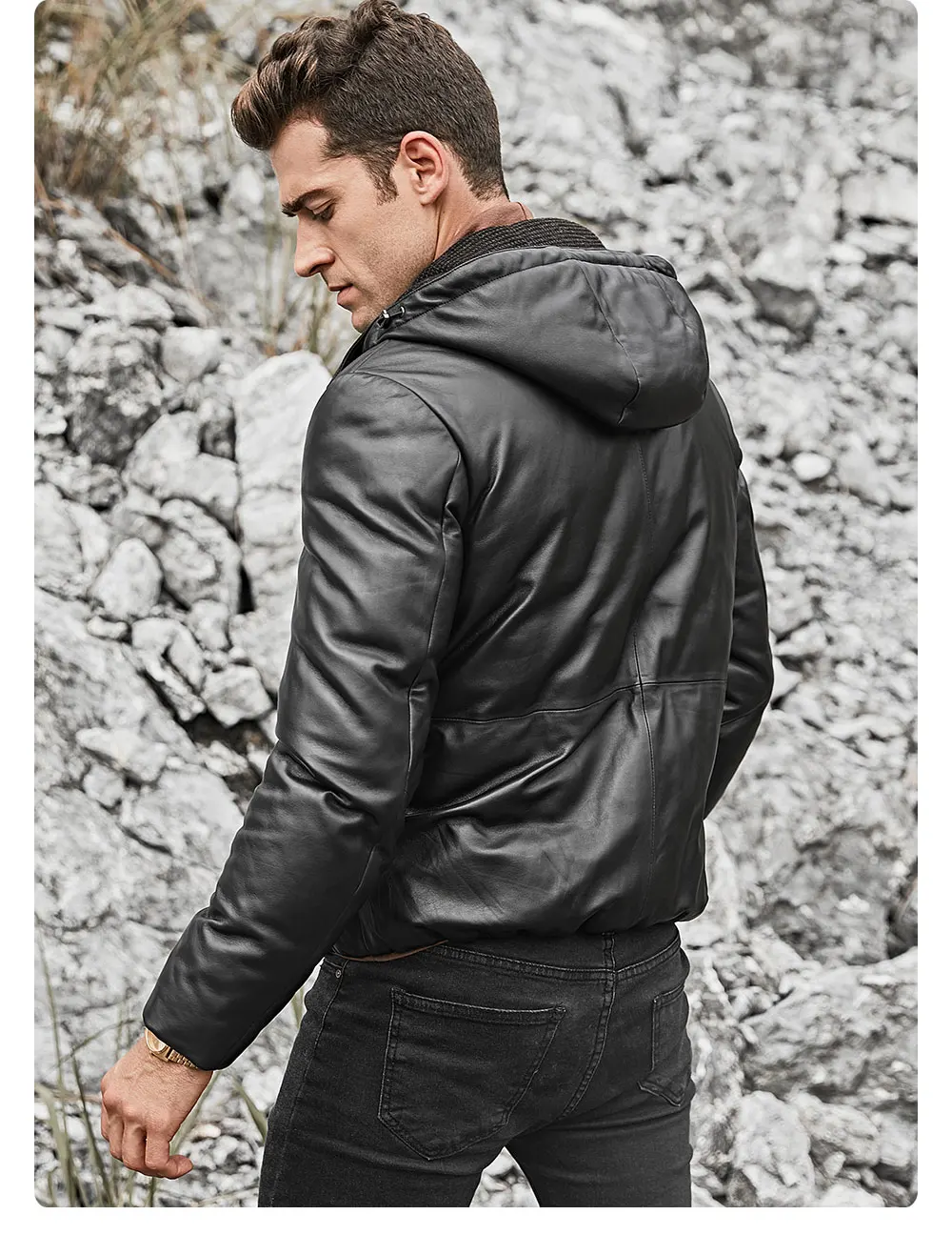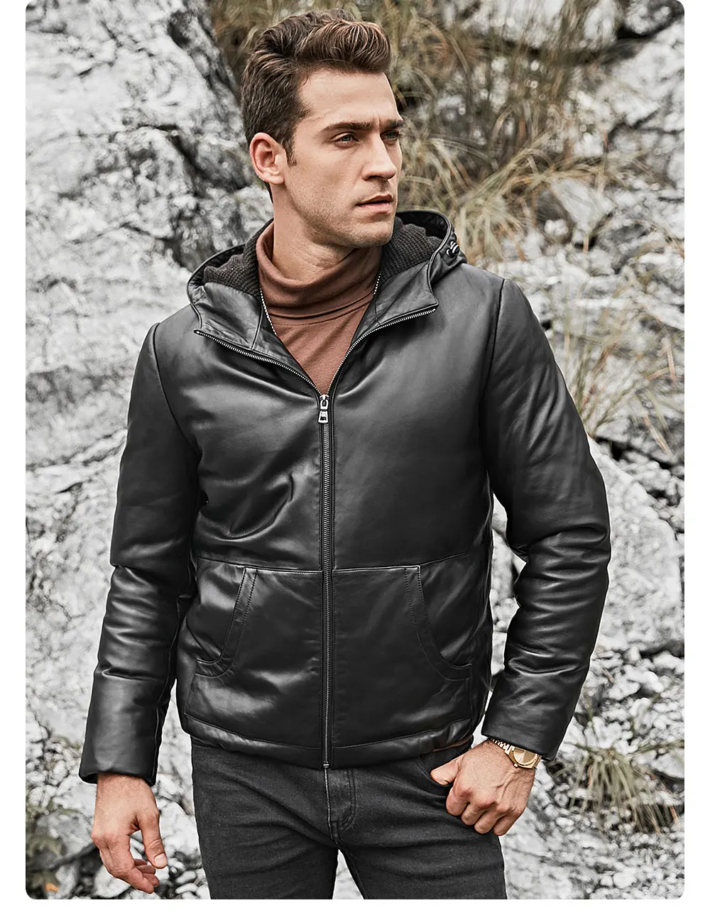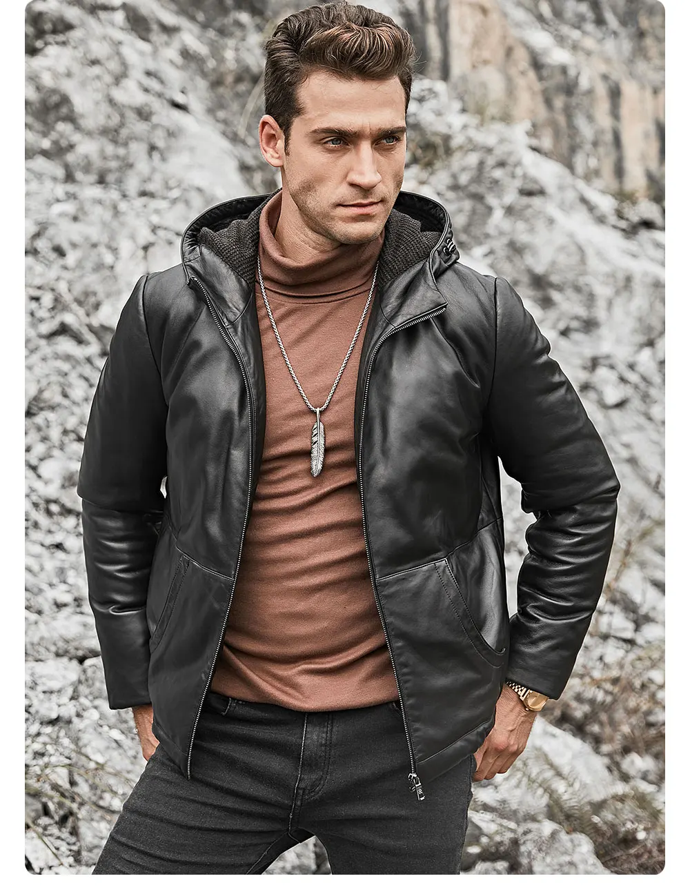 Kожаная куртка мужская толстовка на белом утином пуху FLAVOR, пуховик из натуральной шкуры ягненка, кожаное теплое пальто с капюшоном для зимы