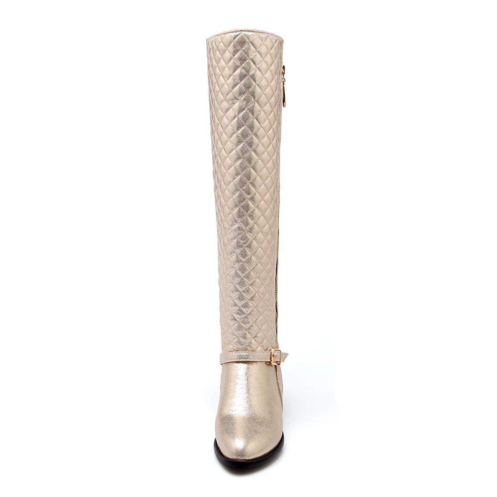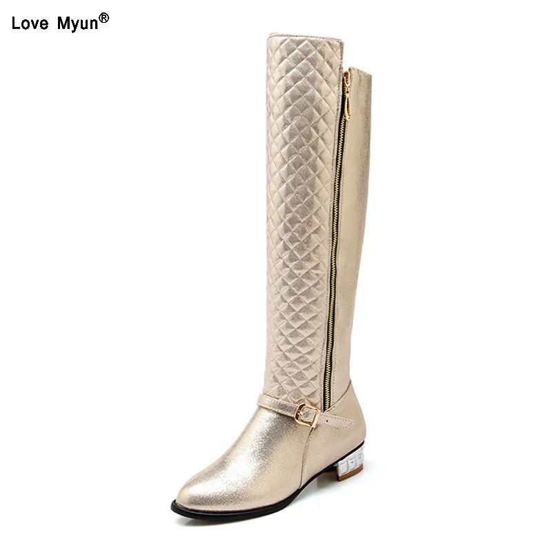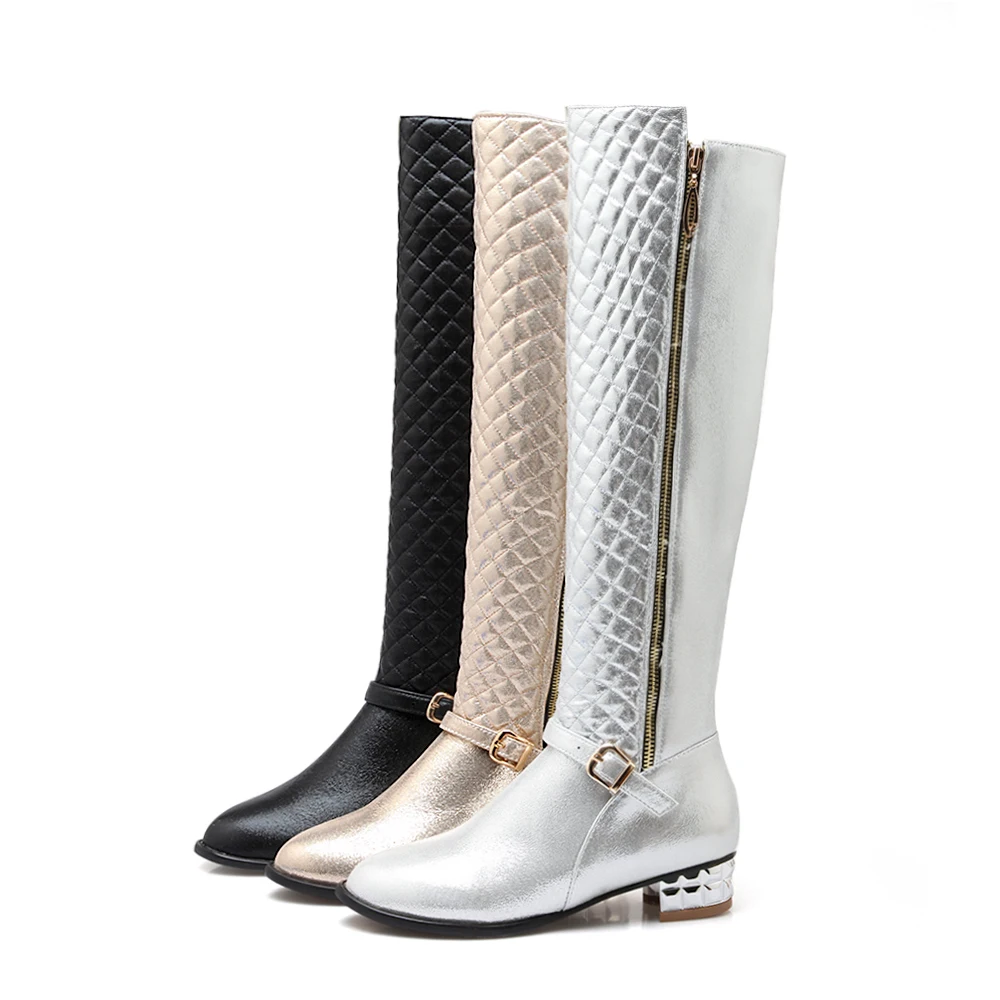 Женские сапоги размера плюс 34-45, новые женские зимние сапоги из PU искусственной кожи на низком квадратном каблуке с пряжкой черного, золотого, серебряного цвета, 896