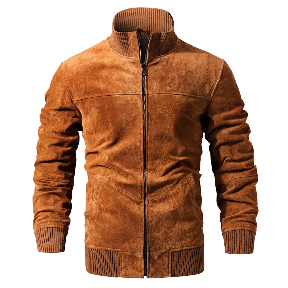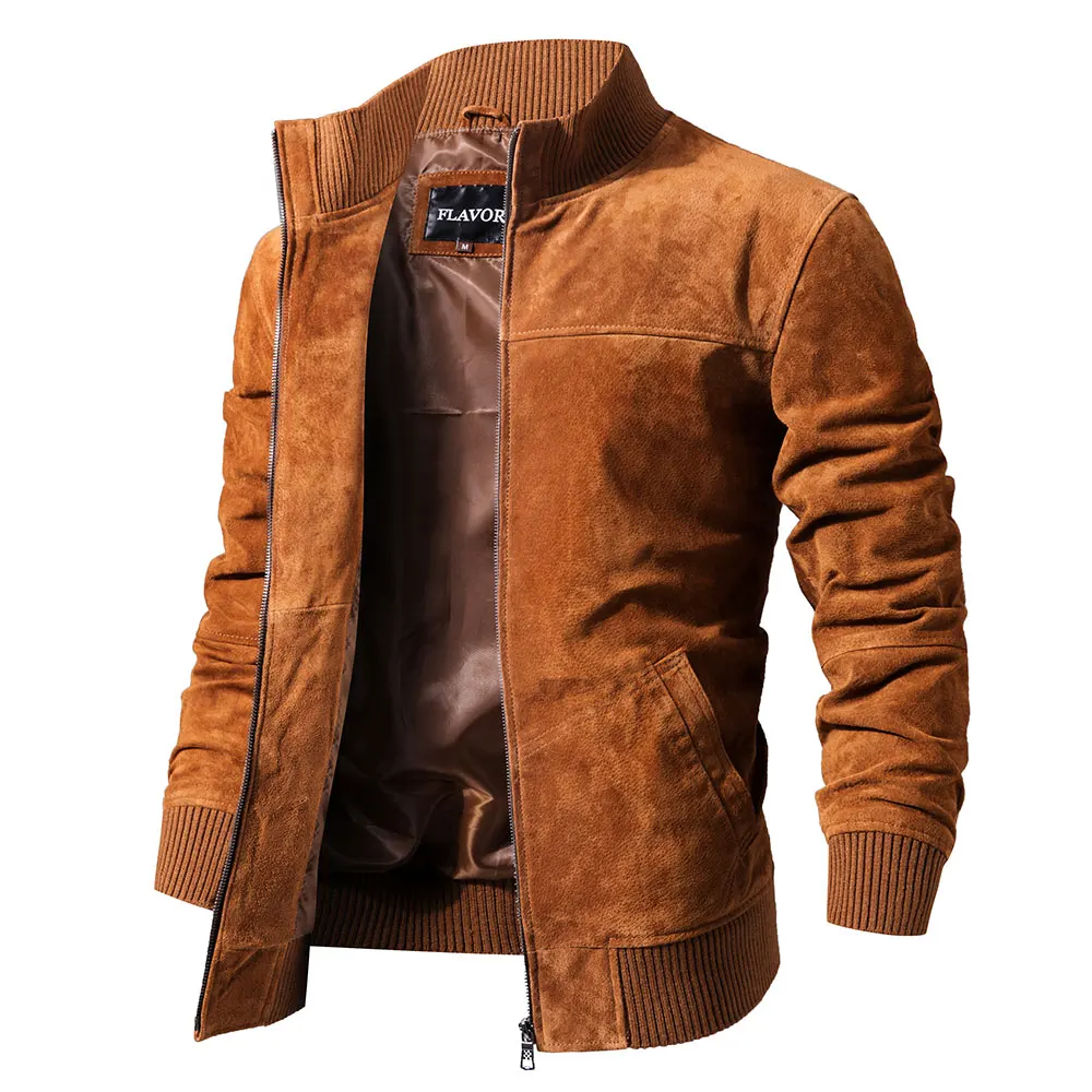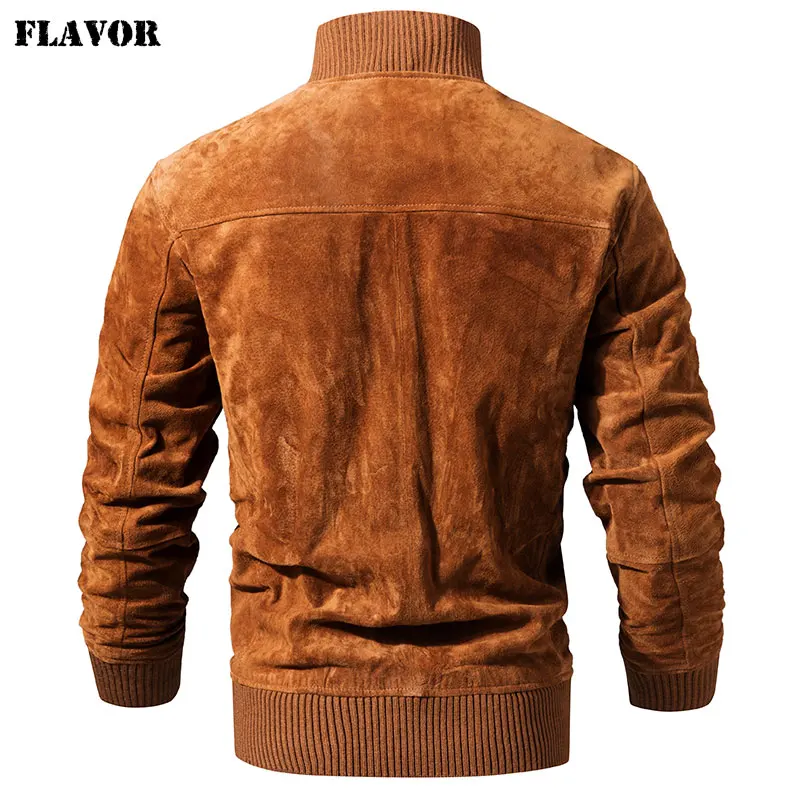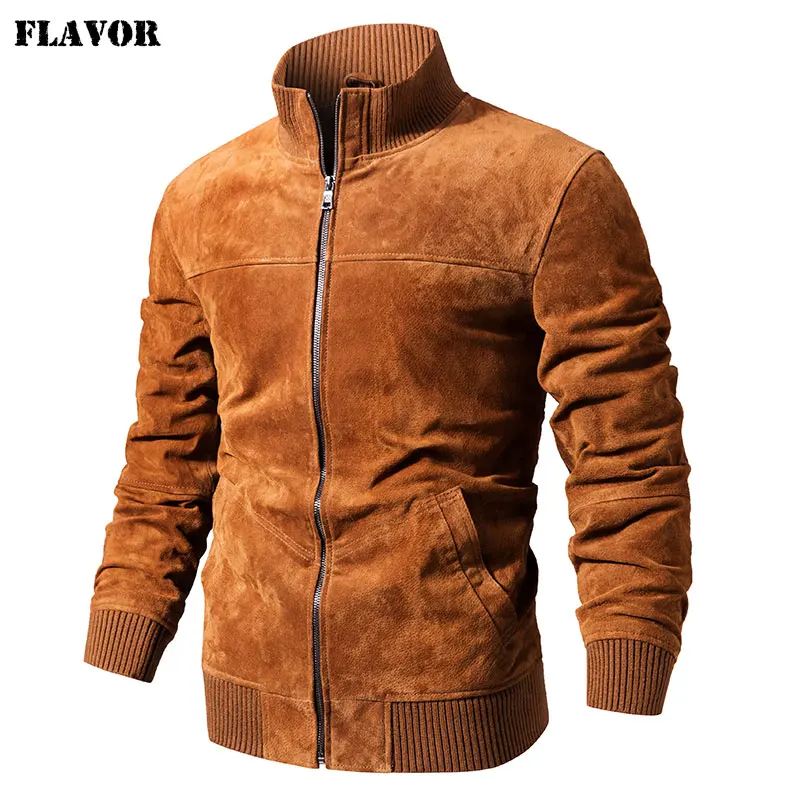 Kожаная куртка мужская FLAVOR, коричневый жакет из натуральной свиной кожи с трикотажными манжетами и воротником стойка, приталенный силуэт, на весну-осень 2019