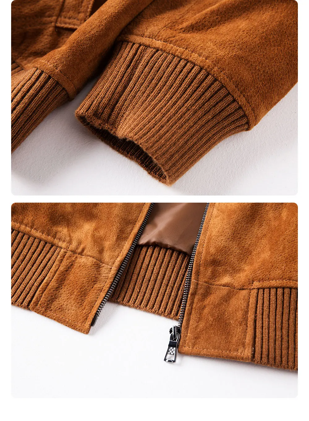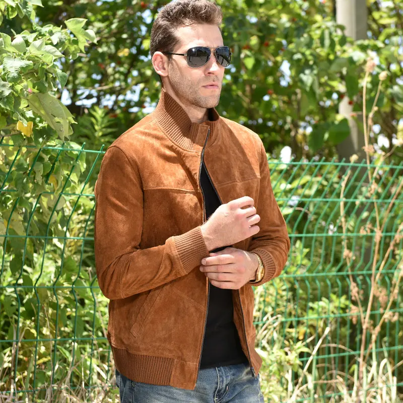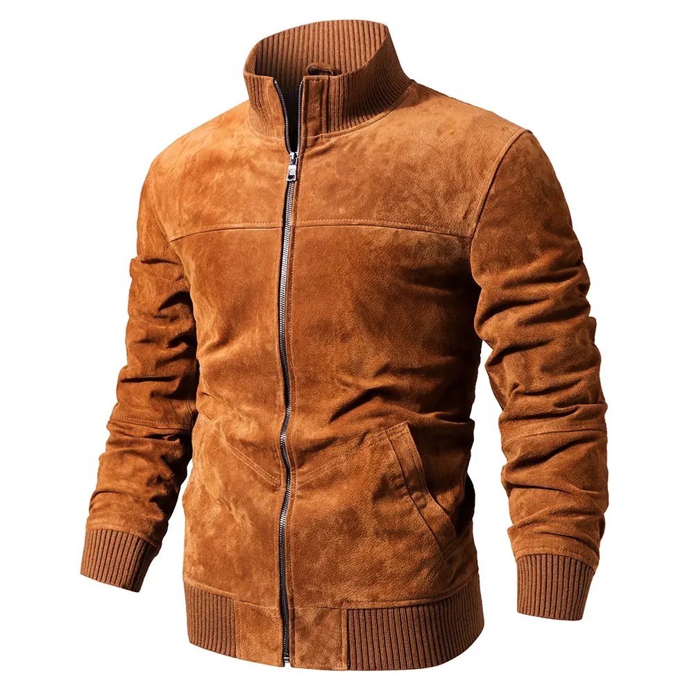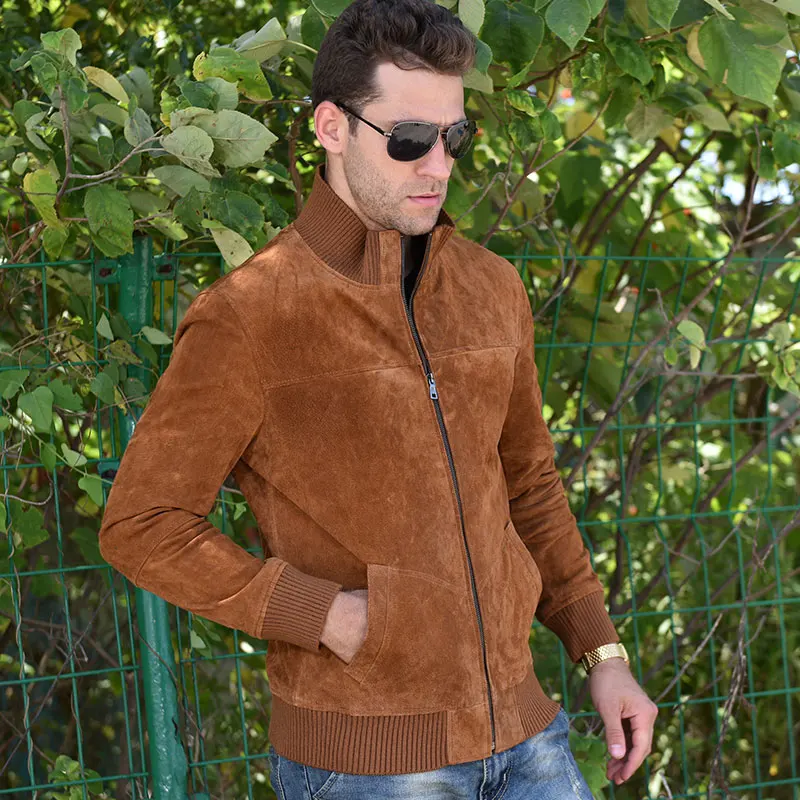 Kожаная куртка мужская FLAVOR, коричневый жакет из натуральной свиной кожи с трикотажными манжетами и воротником стойка, приталенный силуэт, на весну-осень 2019