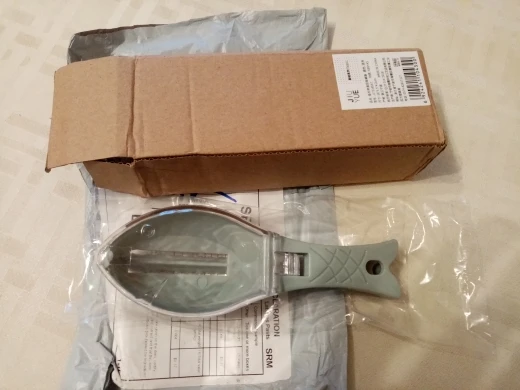 В Минск посылка пришла довольно быстро, чуть больше месяца. Упакован этот инструмент для чистки рыбы был обычный покетик и картонная коробка, одним словом слабо защищён, но прибыл целым и это радует. По моему мнению этот инструмент немного хлипкий, особенно в месте соединения ручки и ёмкости для чешуи. Лучше пусть жена им пользуется, а то я точно быстро сломаю))) В общем - продавцу спасибо и рекомендую!!!