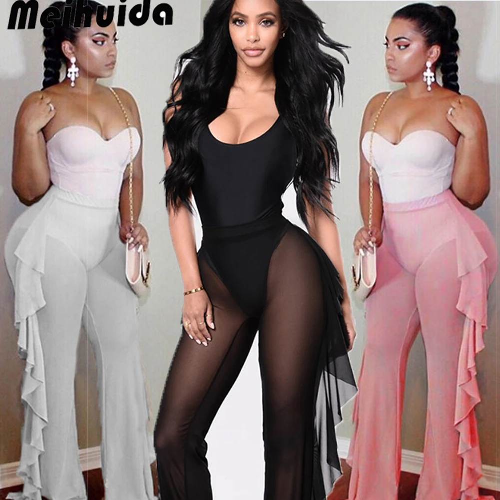 Сексуальные женские сетчатые брюки с оборками, высокая талия, сексуальные женские полупрозрачные летние свободные брюки с широкими штанинами, вечерние штаны