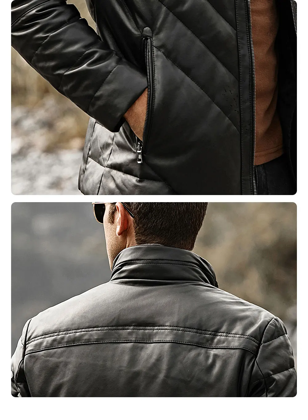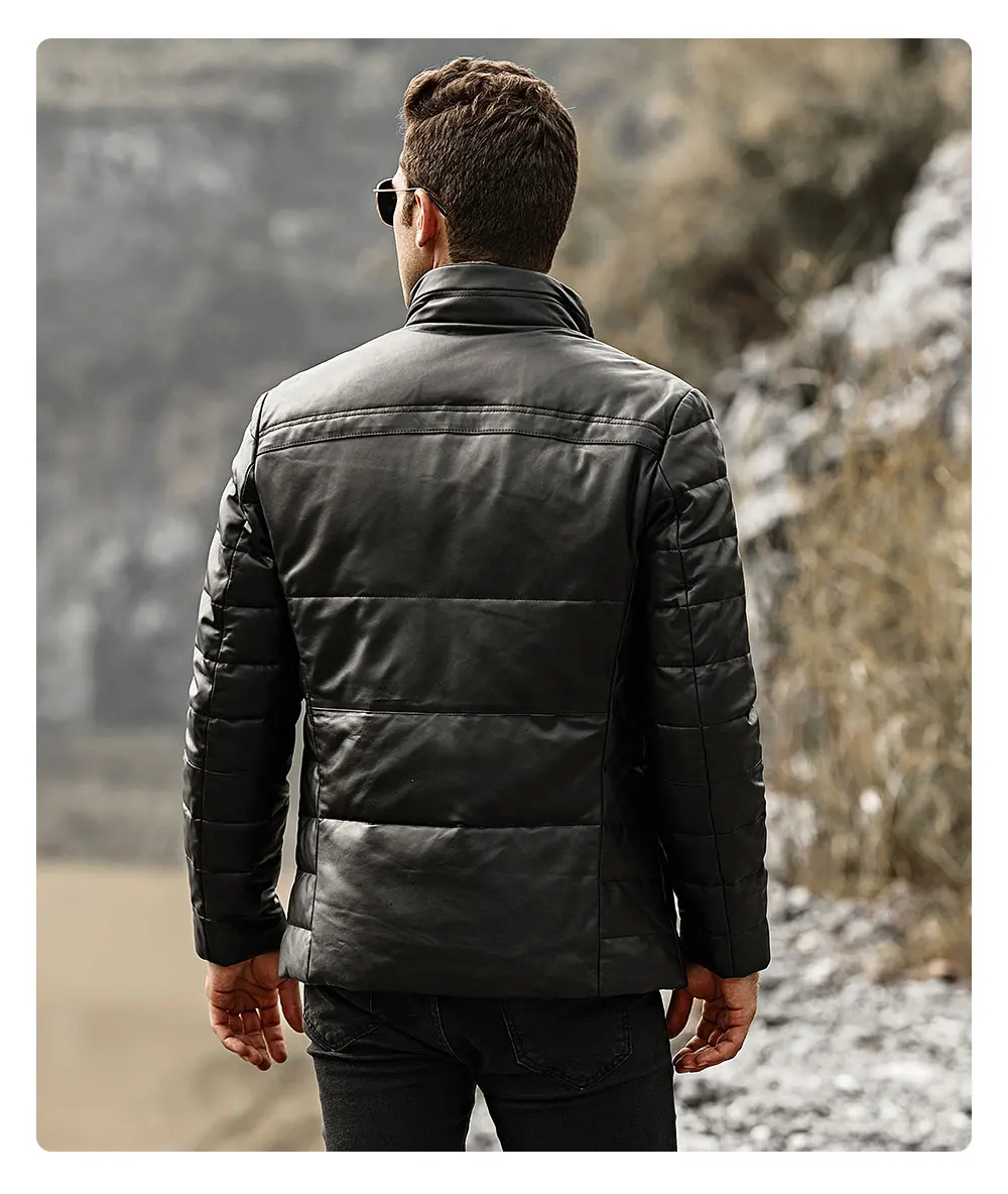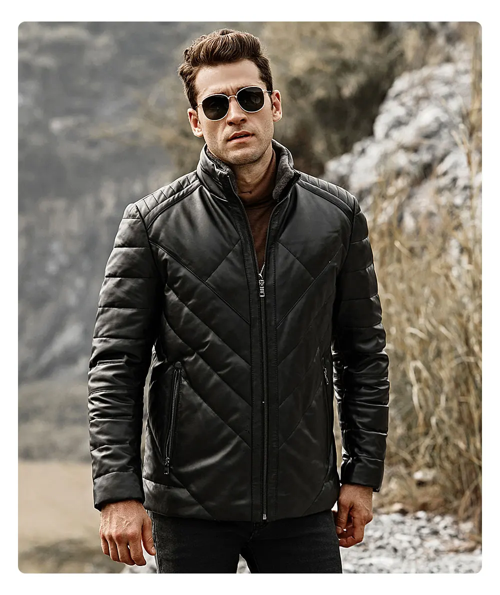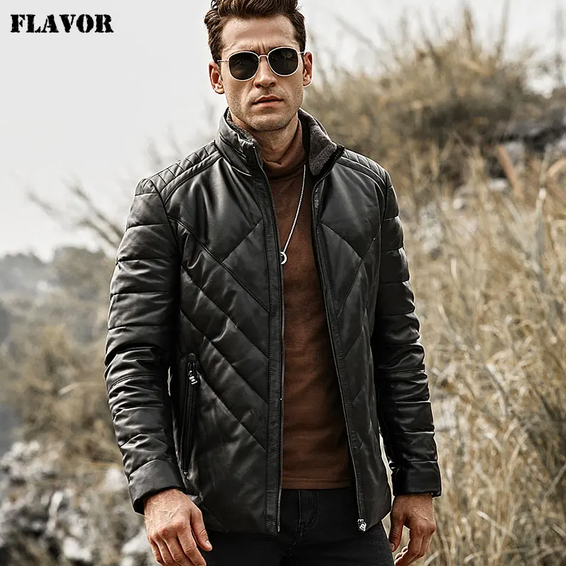 Kожаная куртка мужская FLAVOR, черная дутая куртка из натуральной овечьей кожи, теплый пуховик со съемным воротником стойка из овечьего меха, на зиму 2019