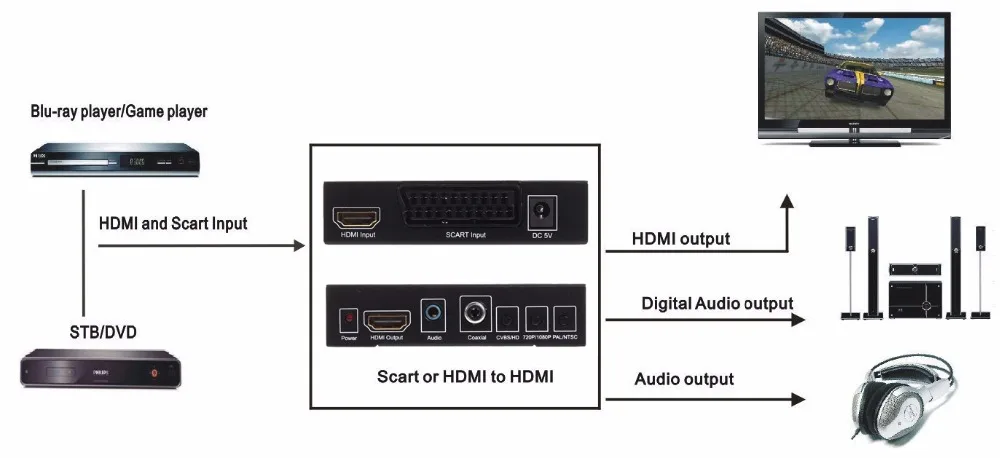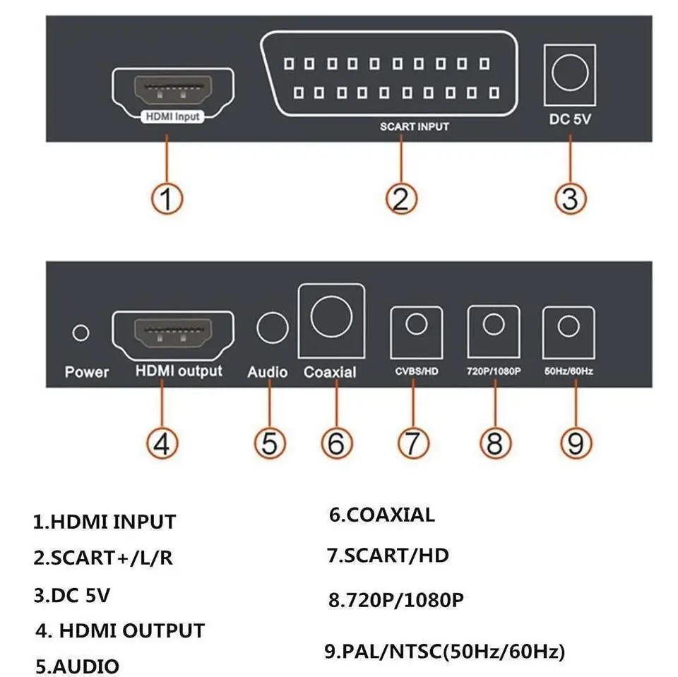 AV video 480I (NTSC)/576I (PAL) или SCART/RGB сигналы и аудио и видео сигналы могут быть преобразованы в 720 P или 1080 P HD HDMI сигналы, и HDMI сигналы высокой четкости также могут быть входными.