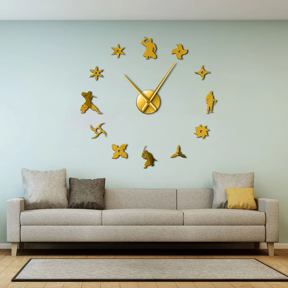 Гигантские настенные часы Shinobi Japon Ninja для самостоятельной сборки, японские бойцы, воины с метательными звездами, Безрамные часы большого времени, зеркальный эффект