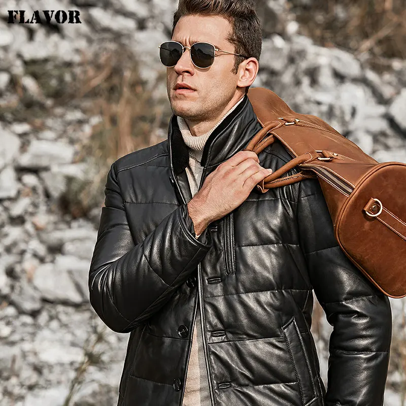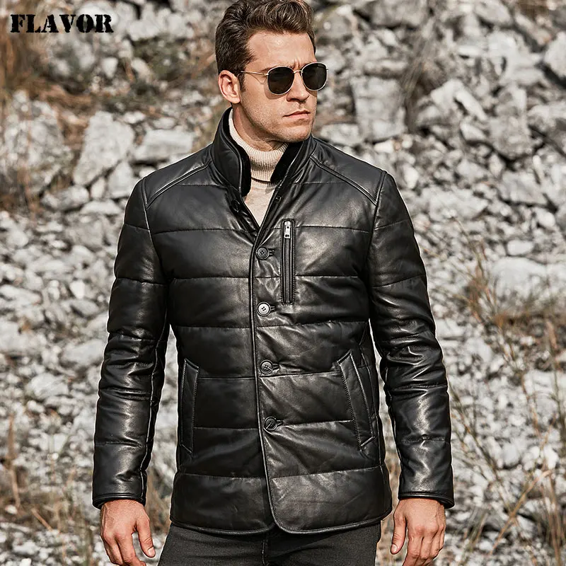 Мужская куртка из шкуры ягненка, зимняя куртка на утином пуху с воротником-стойкой, пальто на пуговицах, 2018