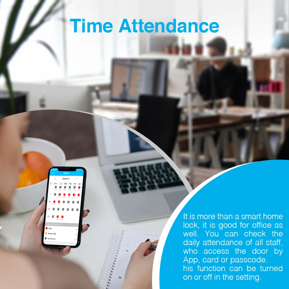 Это не только Умный домашний замок, но и хороший для офиса. Вы можете проверить ежедневную посещаемость всех сотрудников, которые получают доступ к двери через приложение, карту или пароль.Его функция может быть включена или выключена в настройках.