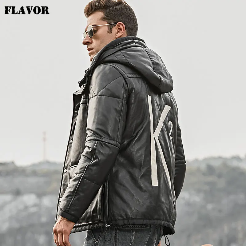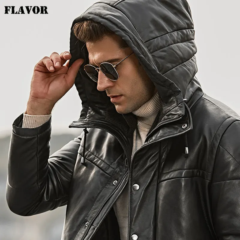 Пуховик мужской из натуральной кожи ягненка, на белом утином пуху, со съемным капюшоном, для зимы