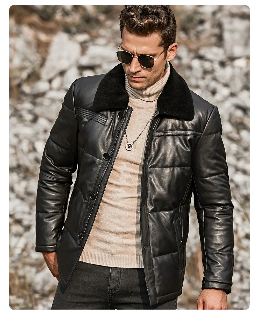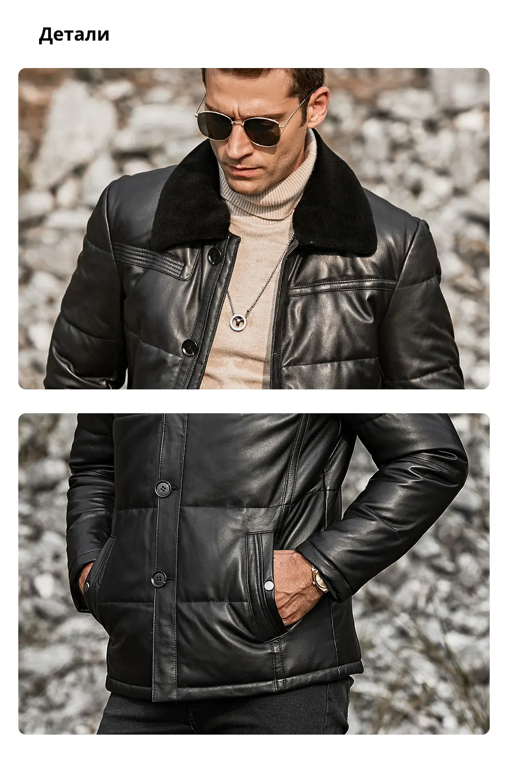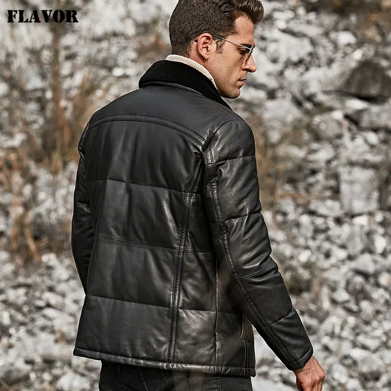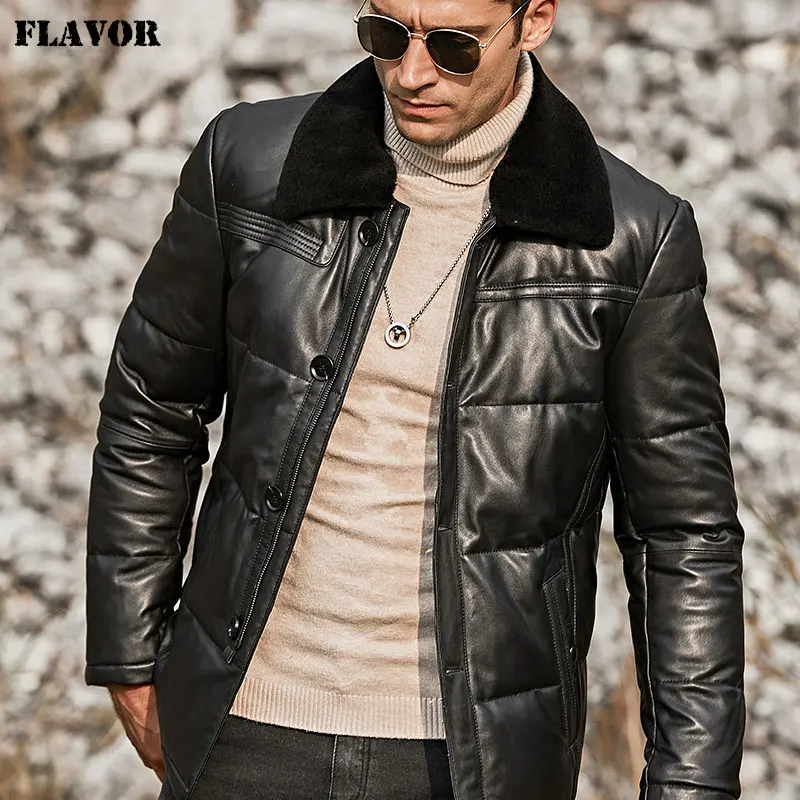 Мужской пуховик из кожи ягненка FLAVOR, теплый пуховик на белом утином пуху со съемным воротником из овечьего меха, для зимы