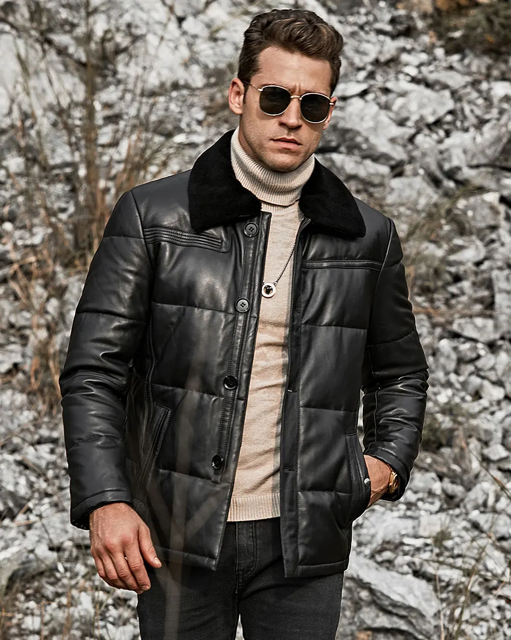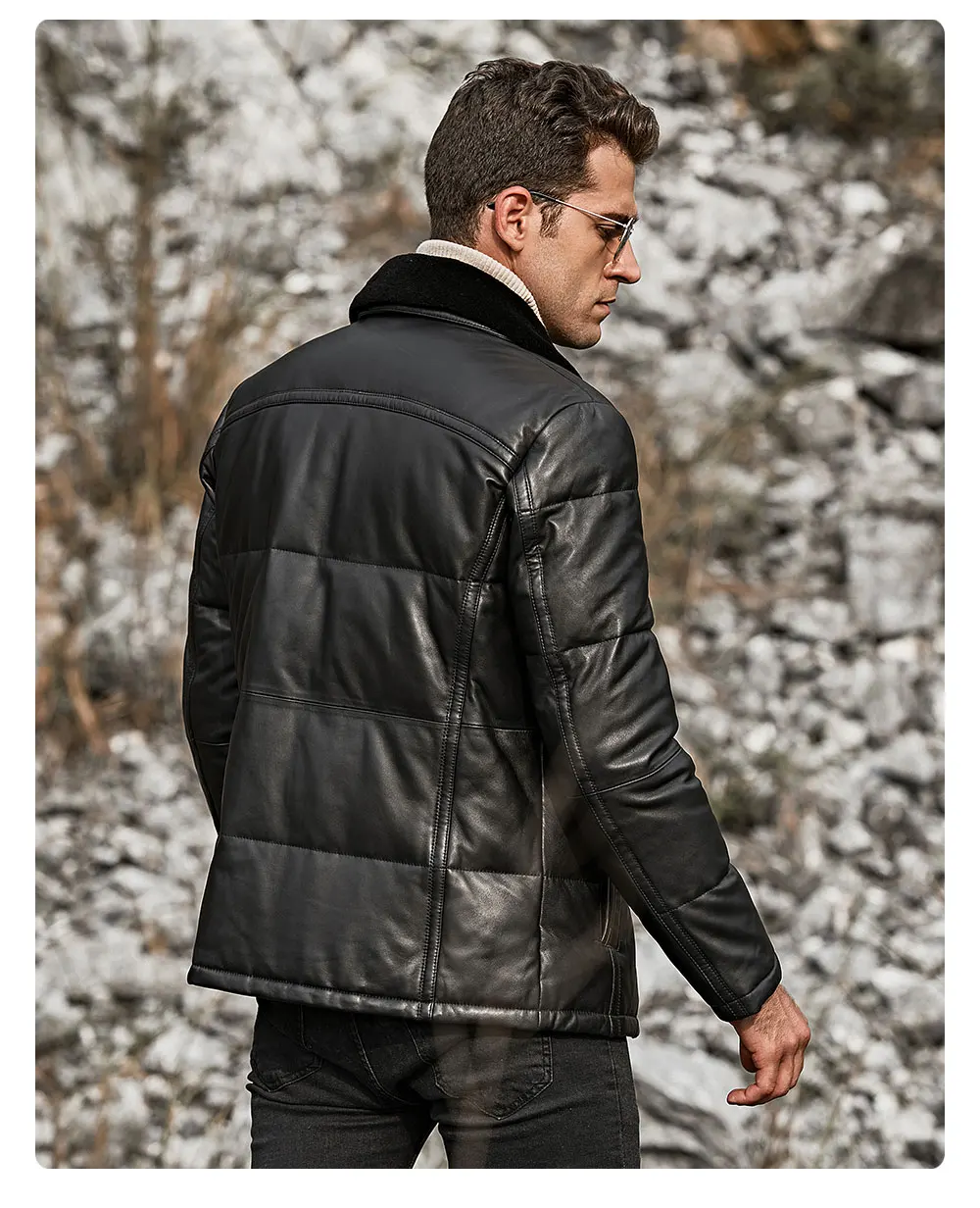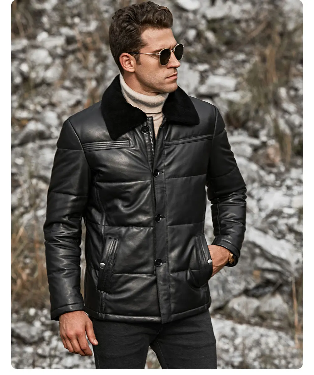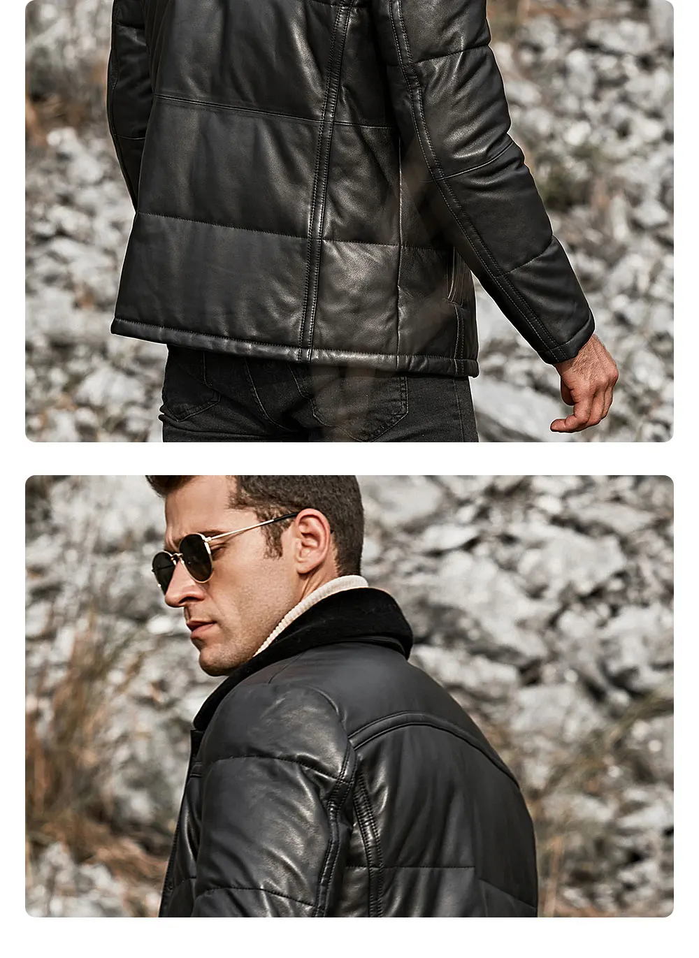 Мужской пуховик из кожи ягненка FLAVOR, теплый пуховик на белом утином пуху со съемным воротником из овечьего меха, для зимы