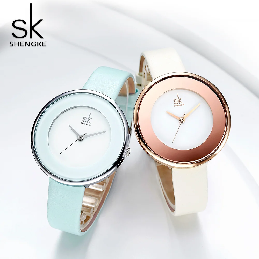 Женские часы с кожаным ремешком и пряжкой SHENGKE, повседневные кварцевые часы с простым циферблатом