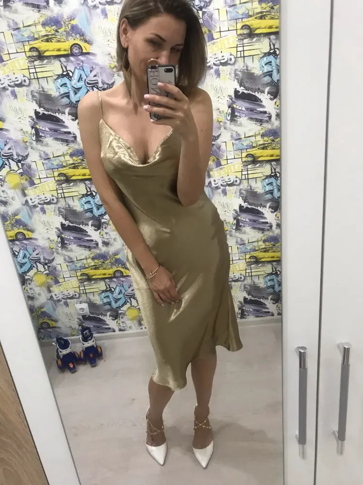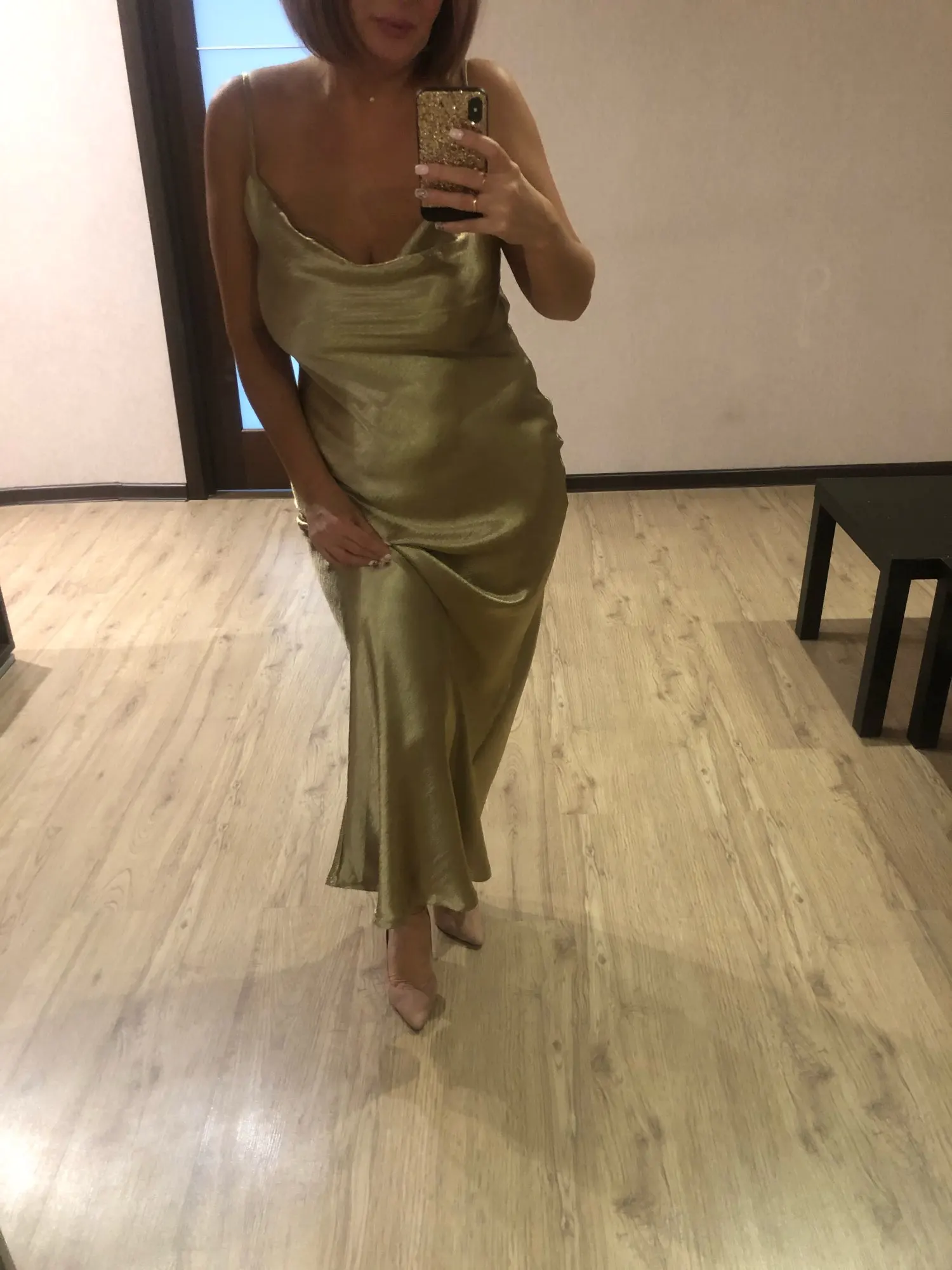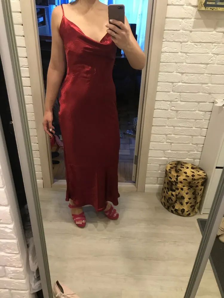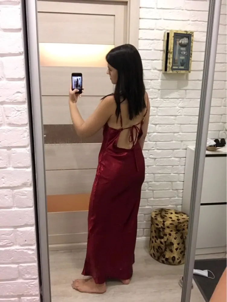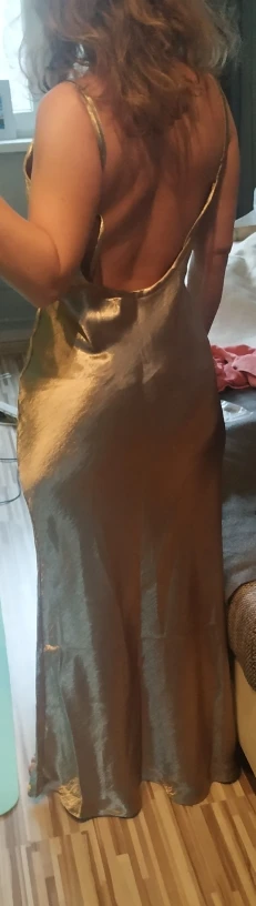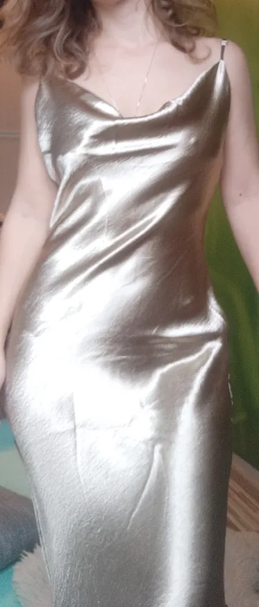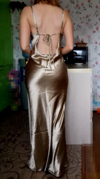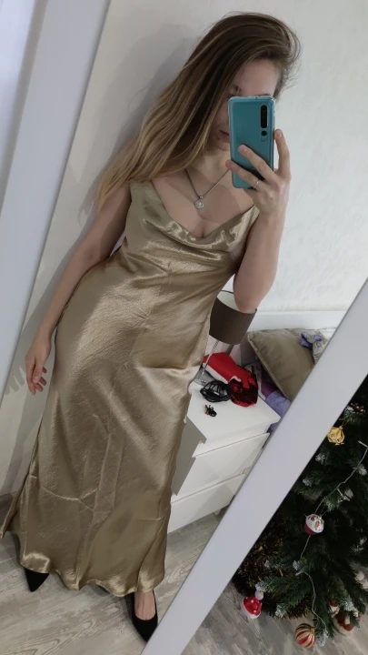 очень красивая ткань, струится и блестит, как эффект жидкого золота, сзади можно регулировать высоту бретелек. На свой размер S, взяла М. Село хорошо даже с небольшим запасом. Смело можно брать размер в размер. К сожалению пошито платье криво и тк ткань растяшивается, то швы растянуты и сборят, особенно заметно по бокам, придётся отдавать в отелье и перешивать. за это 1 звезду снимаю.