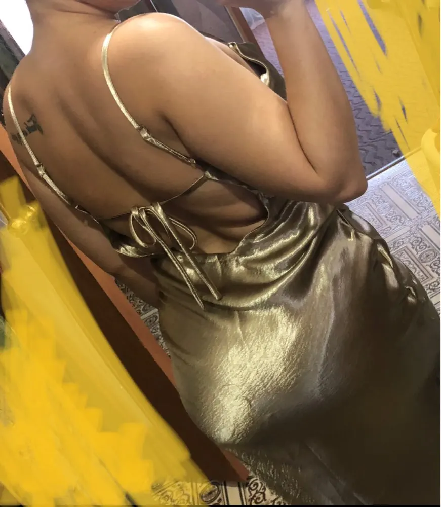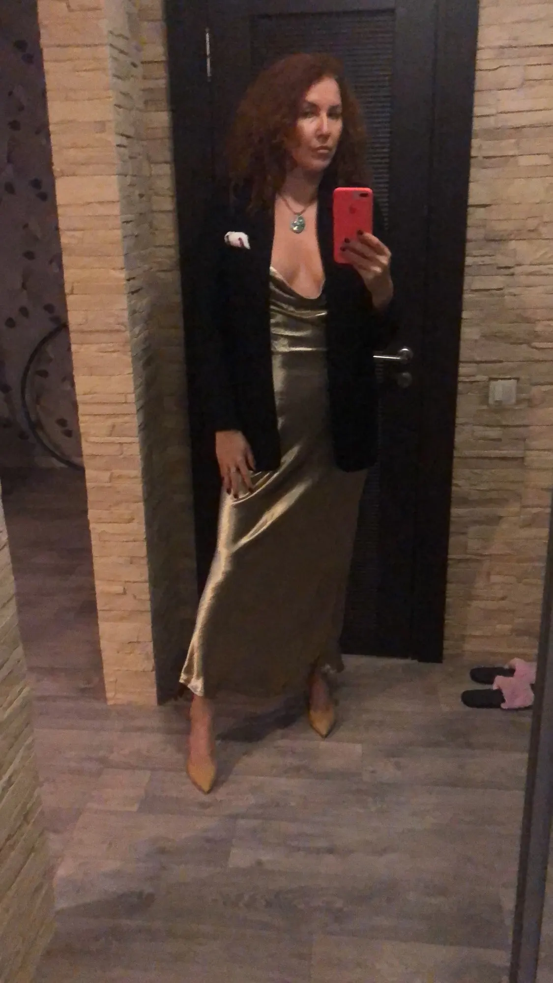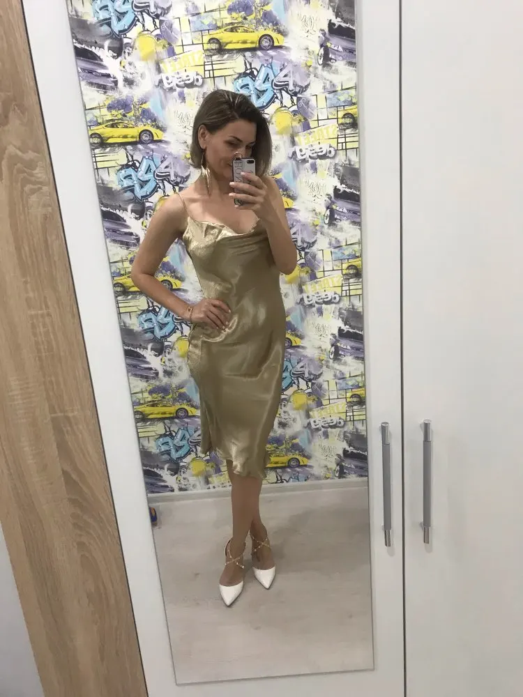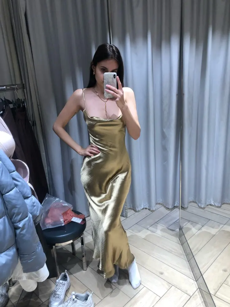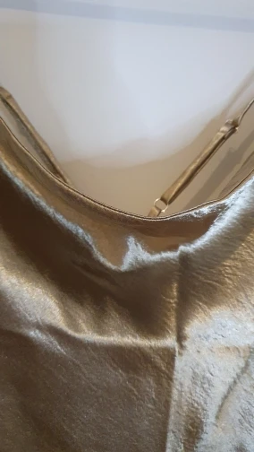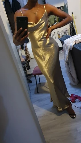 очень красивая ткань, струится и блестит, как эффект жидкого золота, сзади можно регулировать высоту бретелек. На свой размер S, взяла М. Село хорошо даже с небольшим запасом. Смело можно брать размер в размер. К сожалению пошито платье криво и тк ткань растяшивается, то швы растянуты и сборят, особенно заметно по бокам, придётся отдавать в отелье и перешивать. за это 1 звезду снимаю.