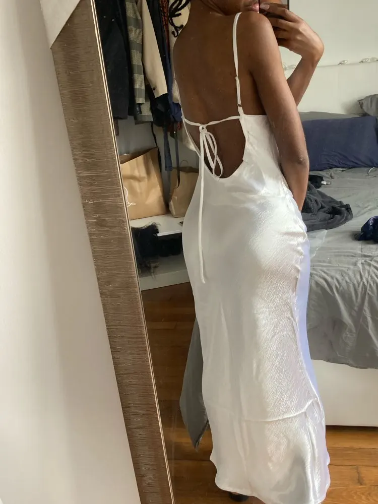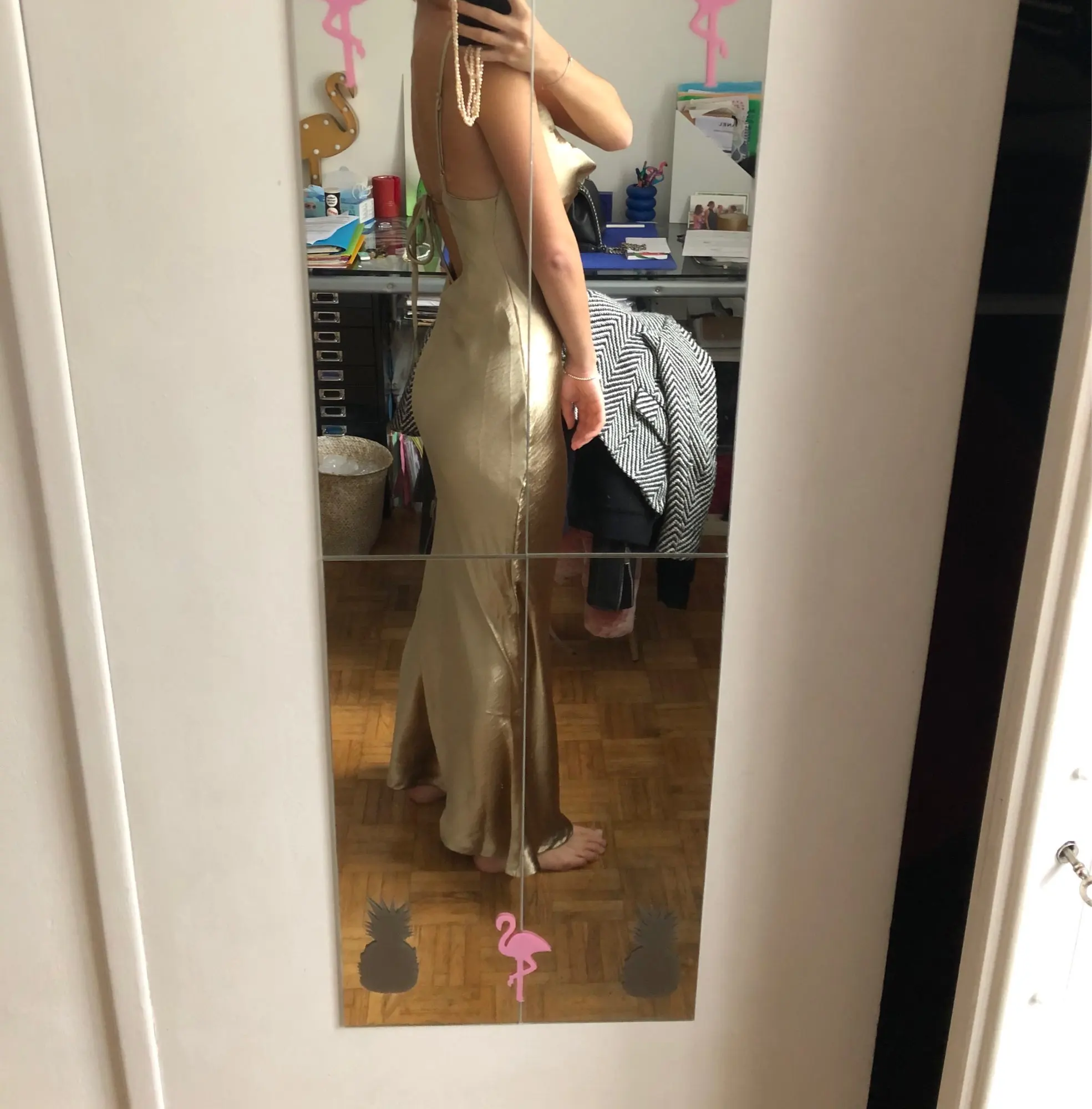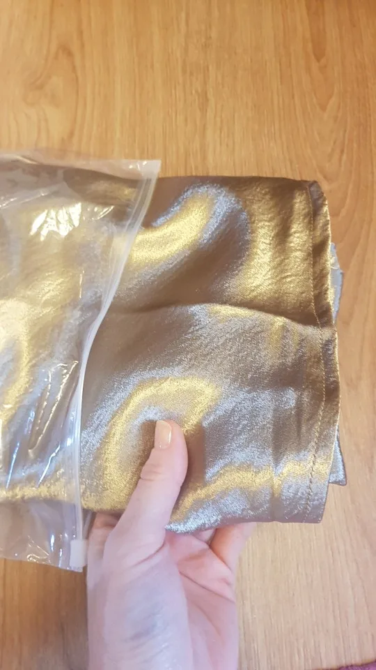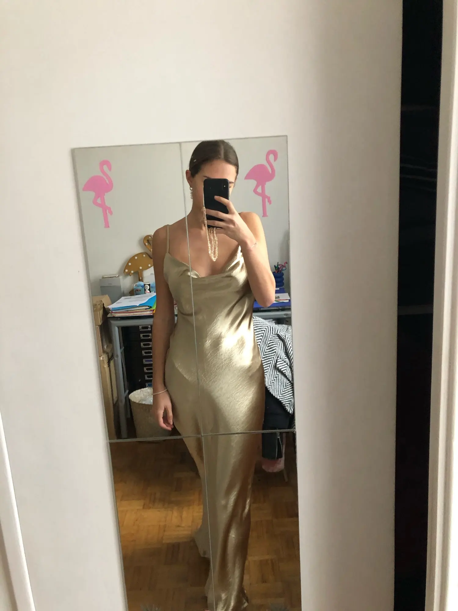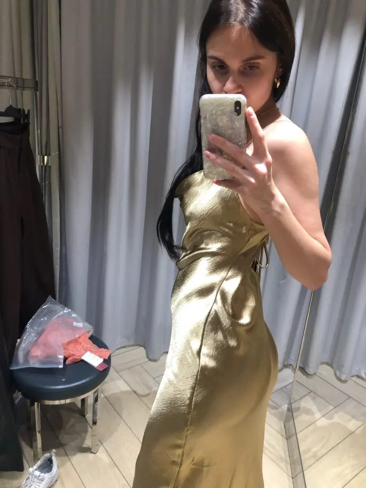 очень красивая ткань, струится и блестит, как эффект жидкого золота, сзади можно регулировать высоту бретелек. На свой размер S, взяла М. Село хорошо даже с небольшим запасом. Смело можно брать размер в размер. К сожалению пошито платье криво и тк ткань растяшивается, то швы растянуты и сборят, особенно заметно по бокам, придётся отдавать в отелье и перешивать. за это 1 звезду снимаю.
