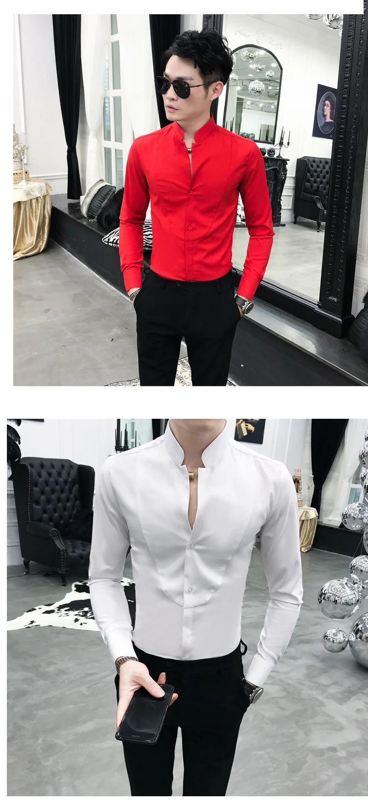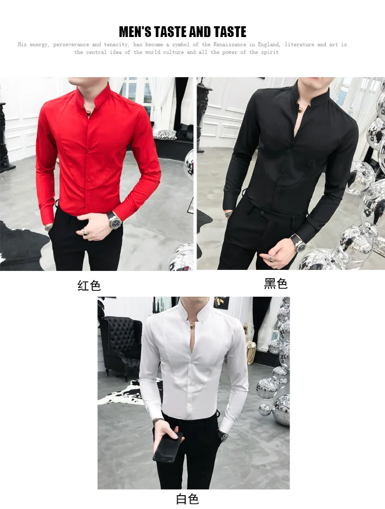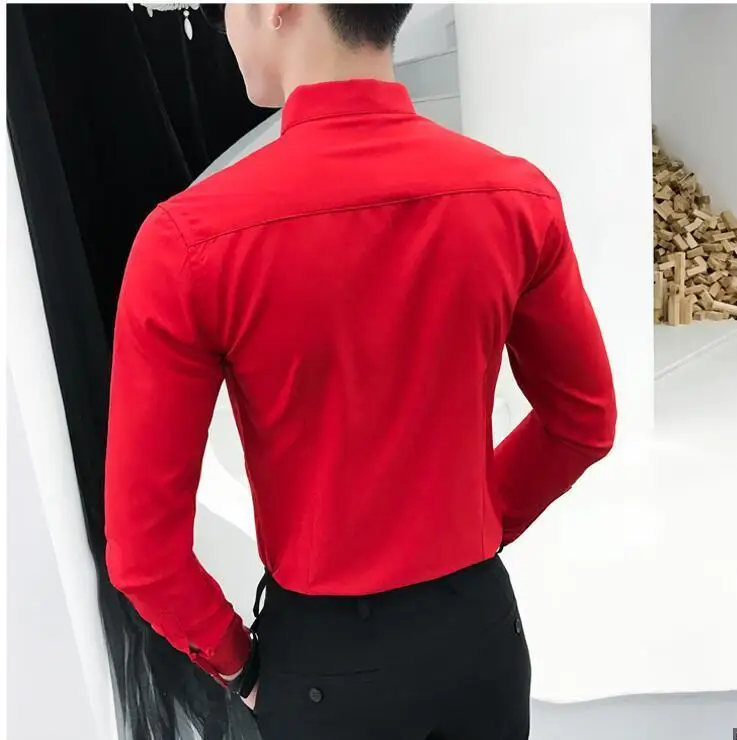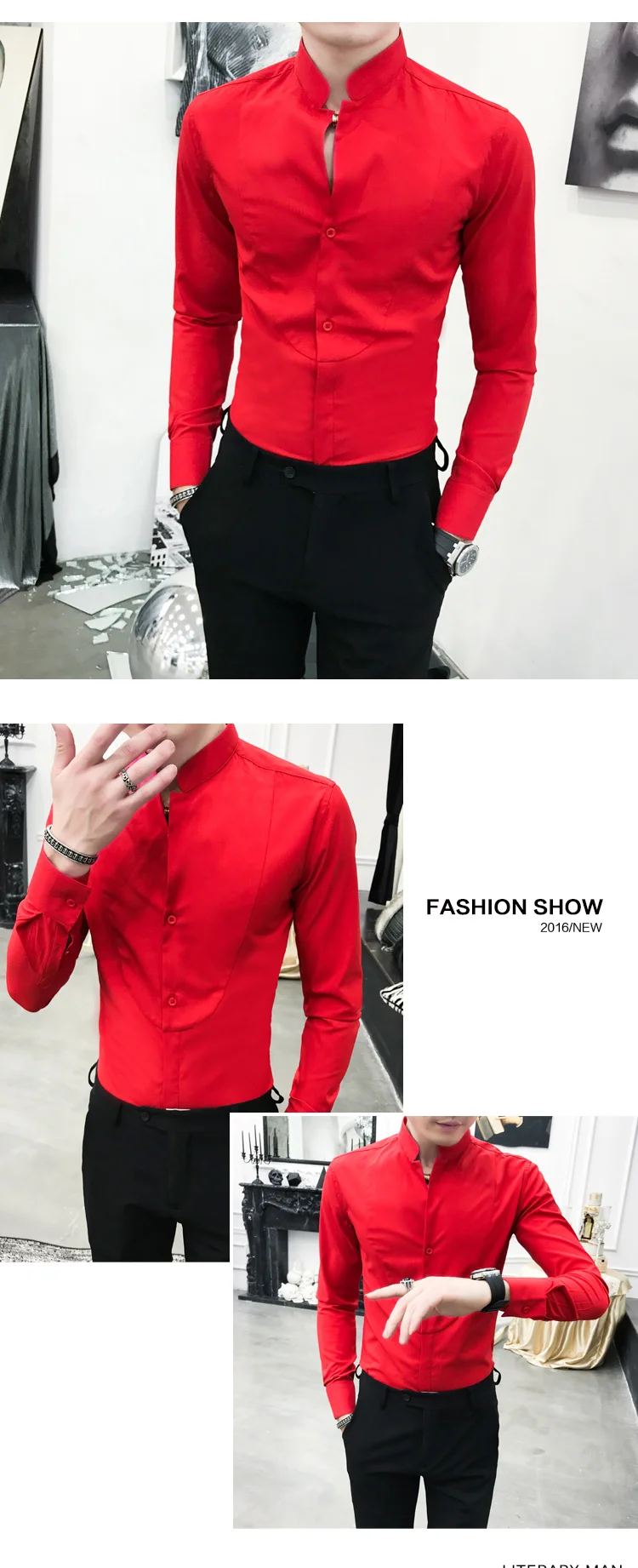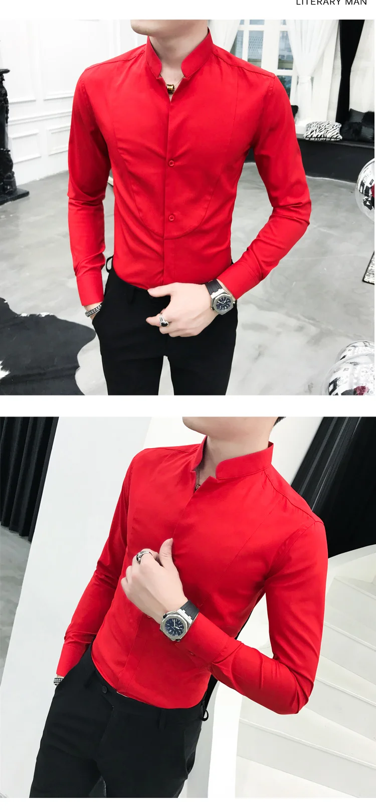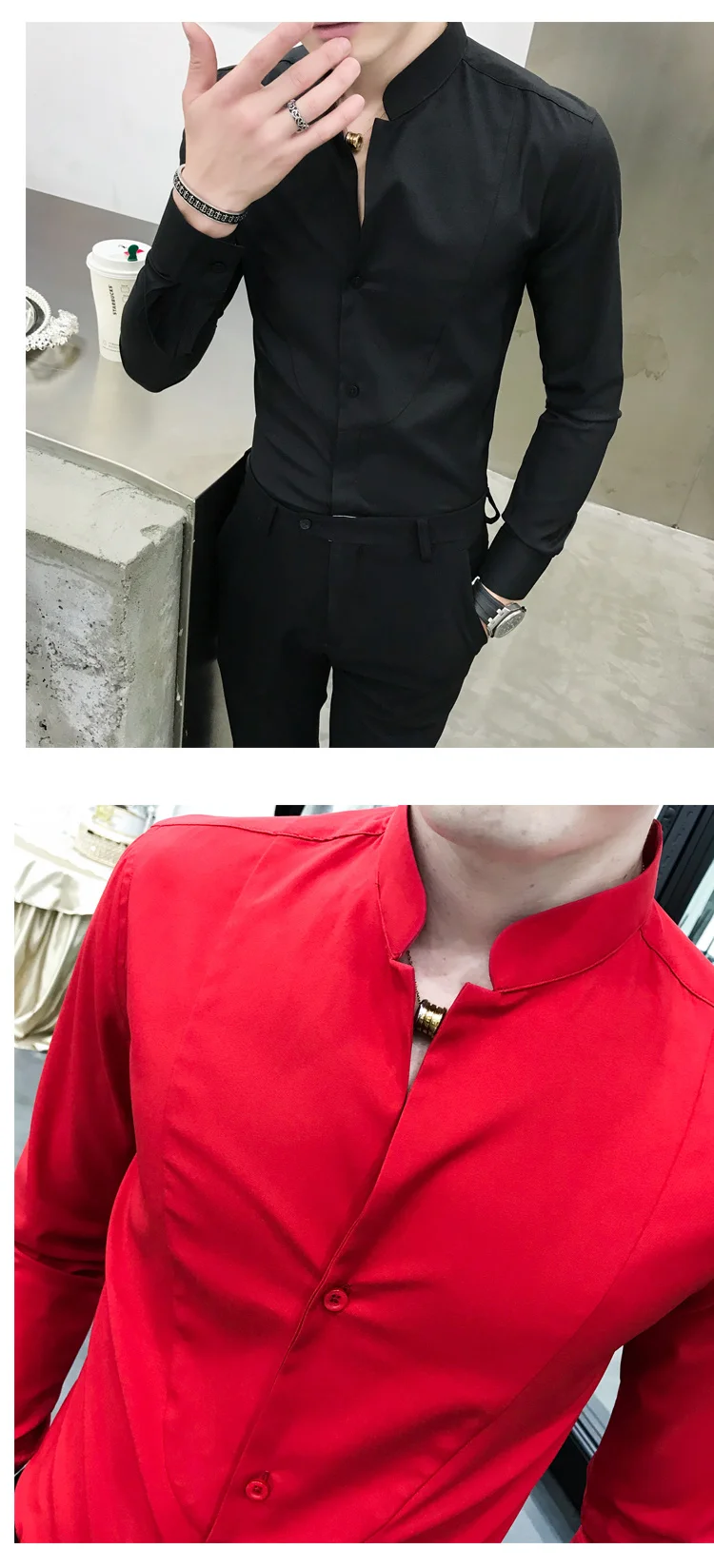 Мужская приталенная рубашка с воротником-стойкой, черная, красная, белая рубашка с длинным рукавом, 2019
