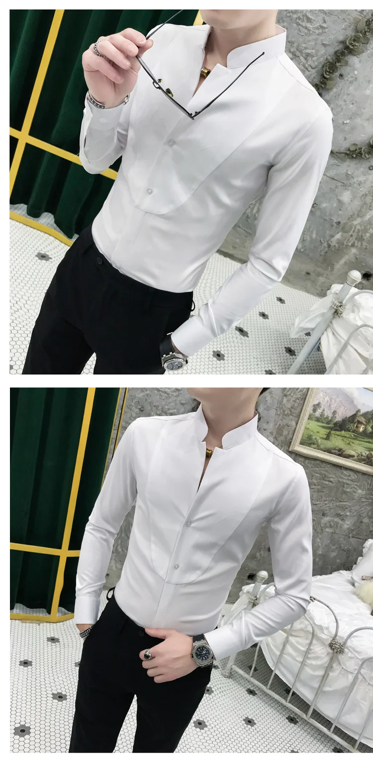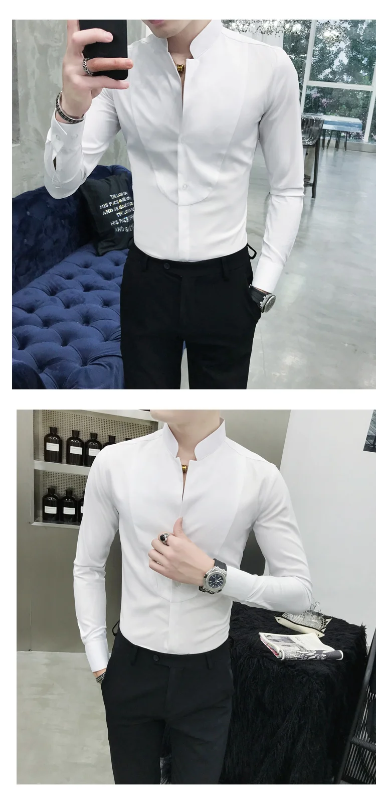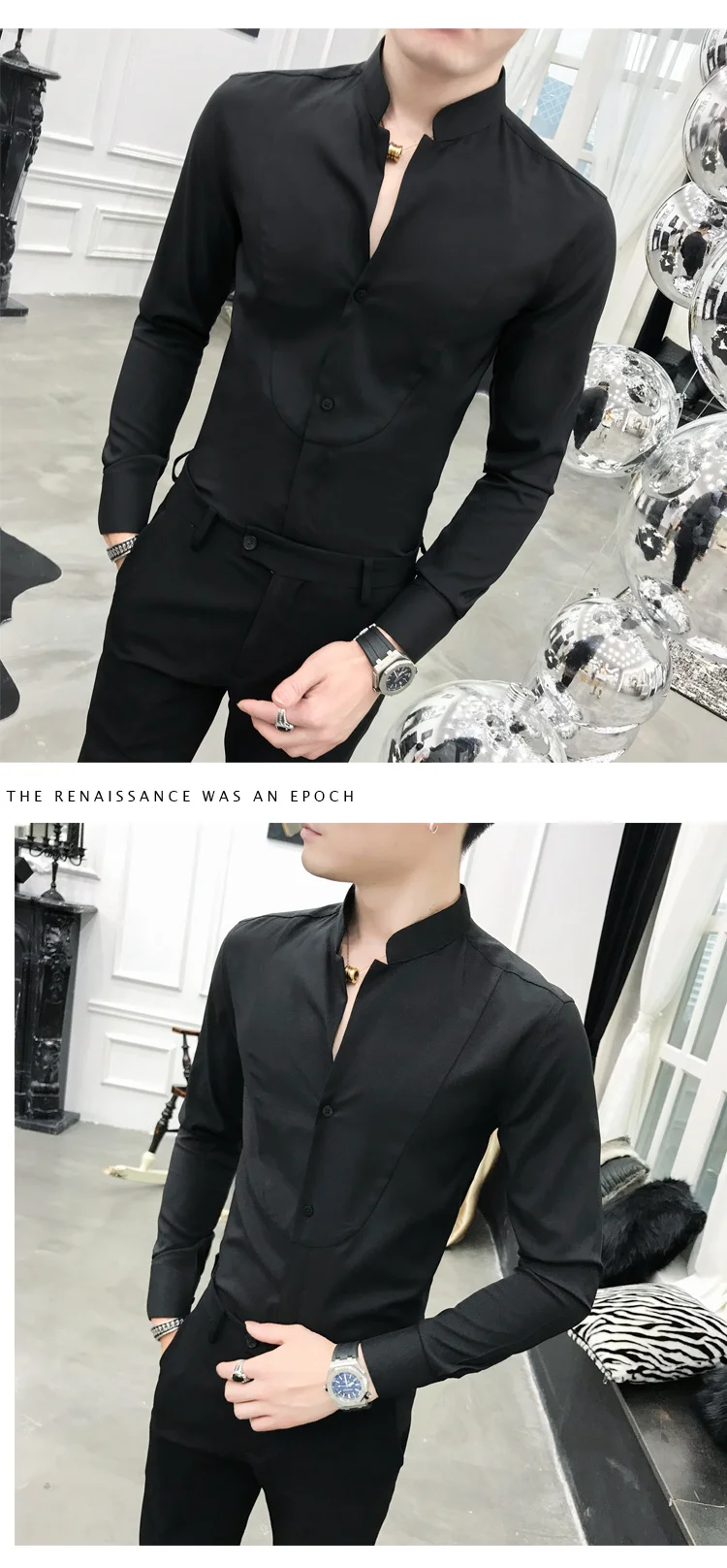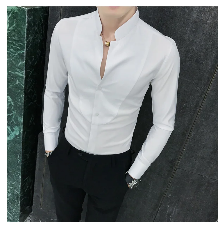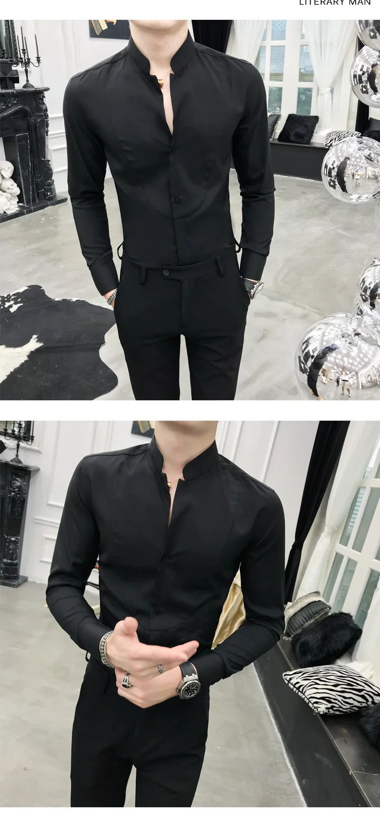 Мужская приталенная рубашка с воротником-стойкой, черная, красная, белая рубашка с длинным рукавом, 2019