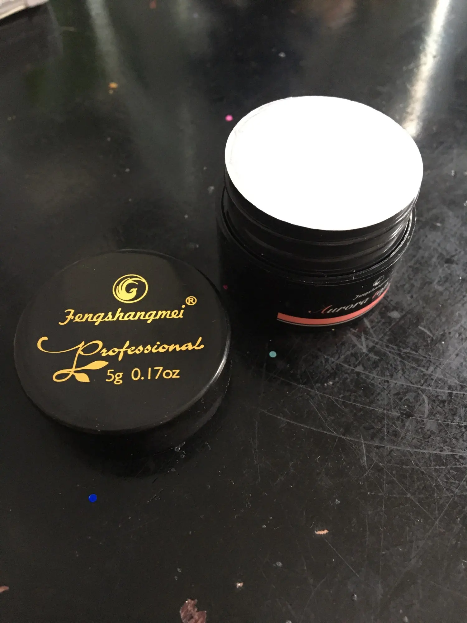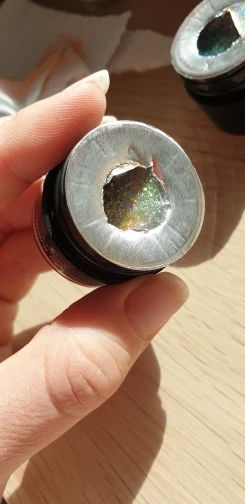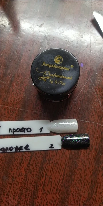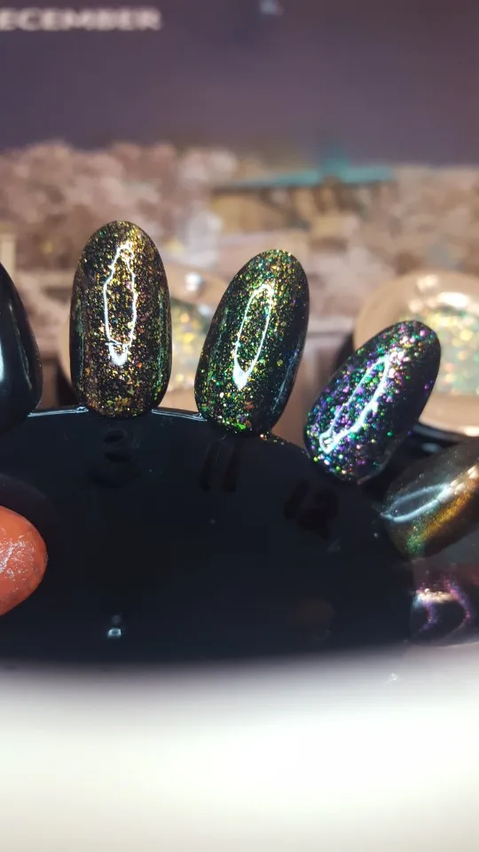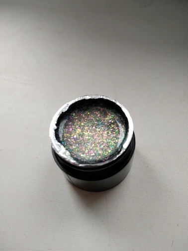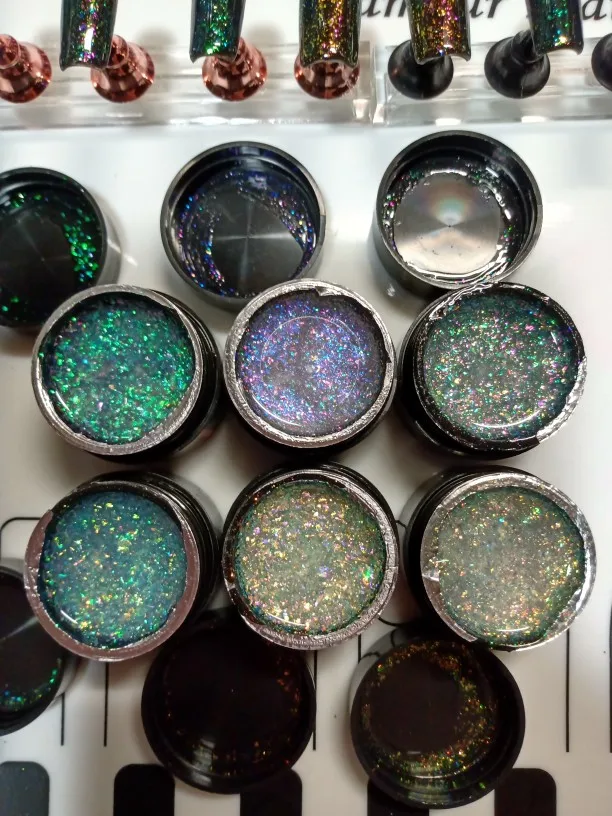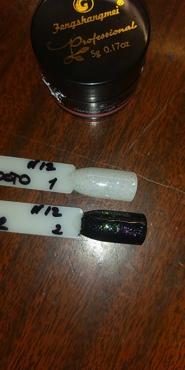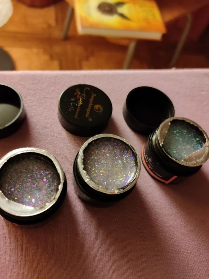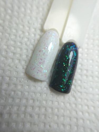 Наконец-то дождалась эти гель лаки, думала уже не приедут, доставка больше двух месяцев в Киев...пришли в сохранности, баночки целые...они реально красивые, переливаются и блестят, белый идеально подойдёт под текстуру какого-то даже камня, например опала, он на вид молочный с блестками-хамелеонам...наносить их только на цветную базу, в идеале чёрную или белую, сами прозрачные