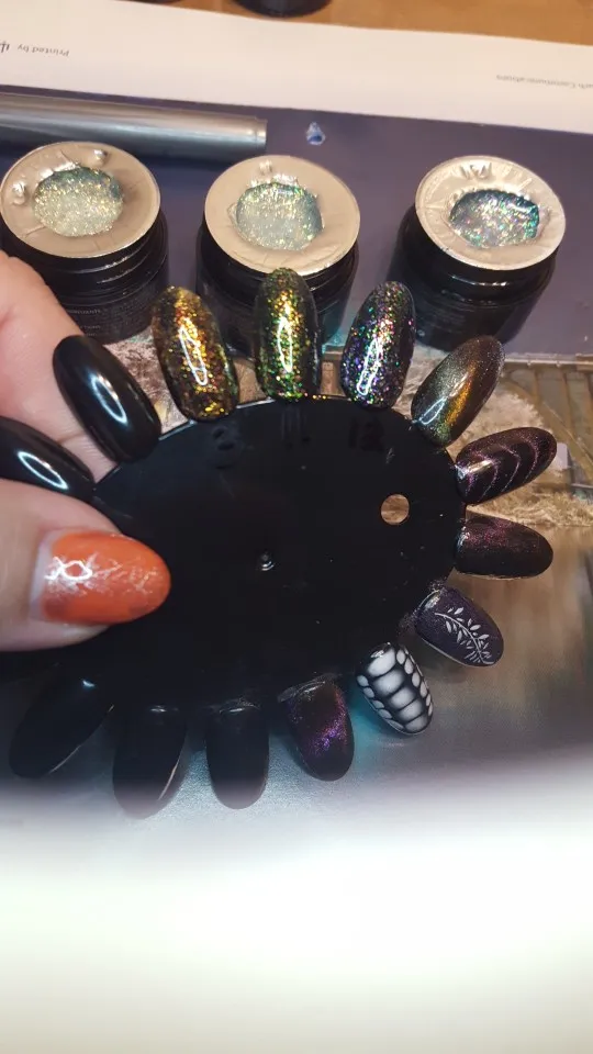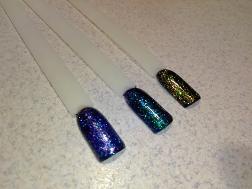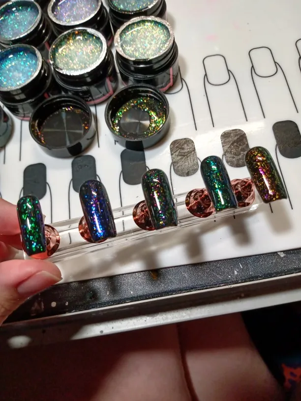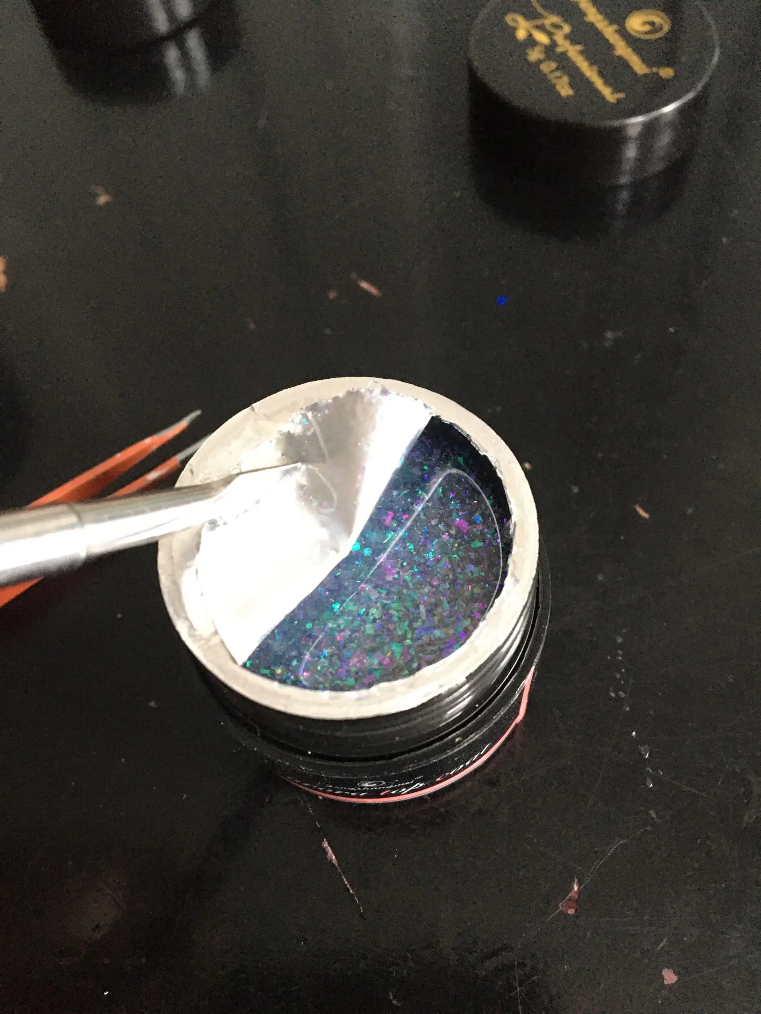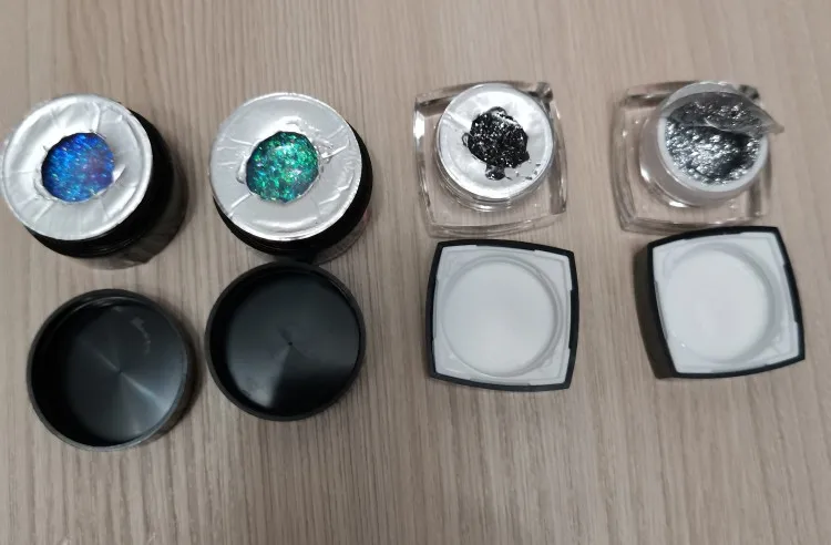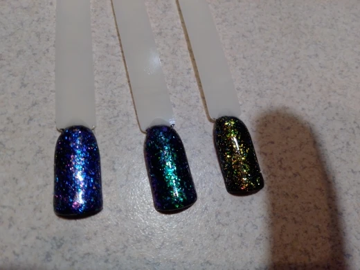 Наконец-то дождалась эти гель лаки, думала уже не приедут, доставка больше двух месяцев в Киев...пришли в сохранности, баночки целые...они реально красивые, переливаются и блестят, белый идеально подойдёт под текстуру какого-то даже камня, например опала, он на вид молочный с блестками-хамелеонам...наносить их только на цветную базу, в идеале чёрную или белую, сами прозрачные
