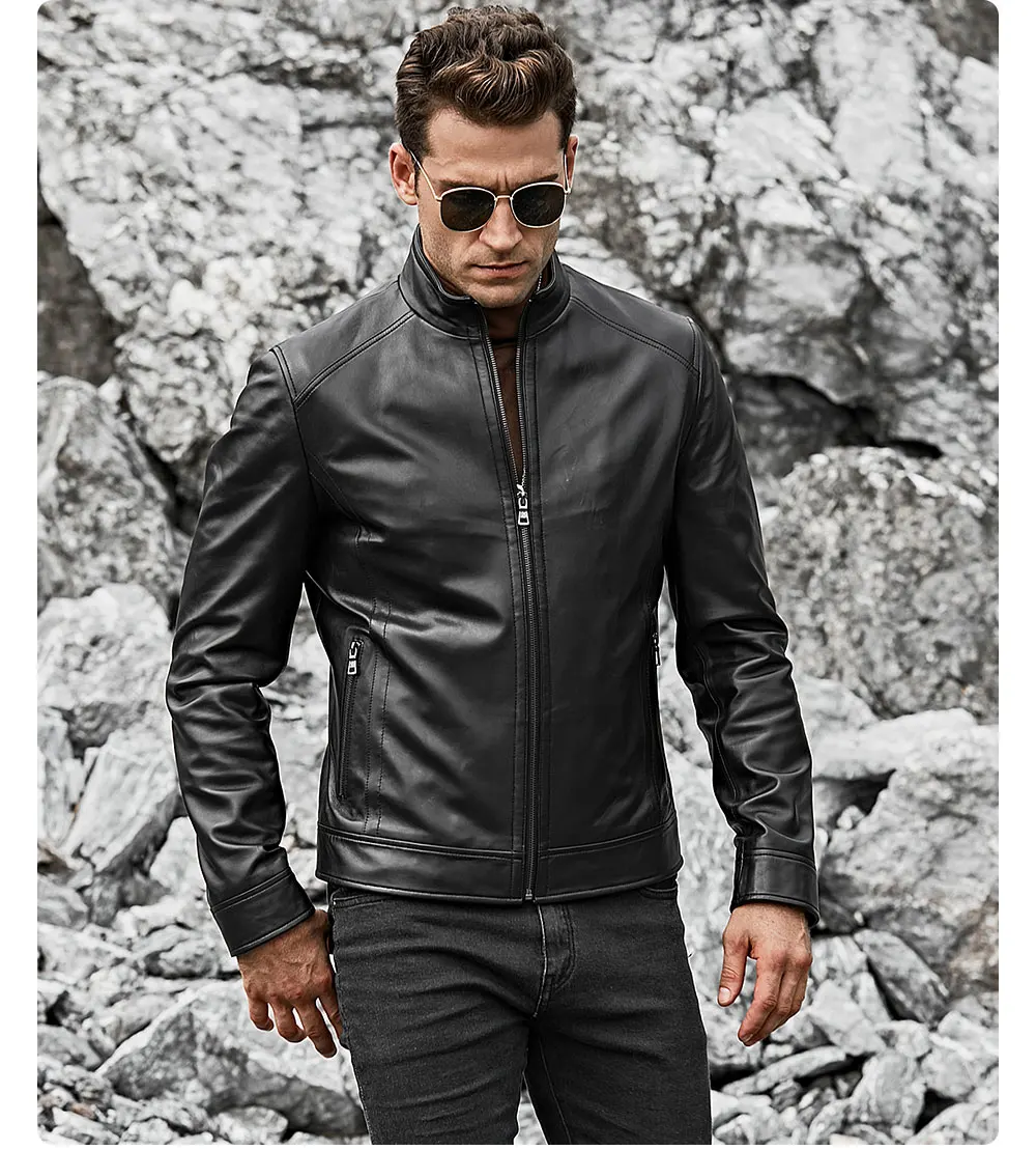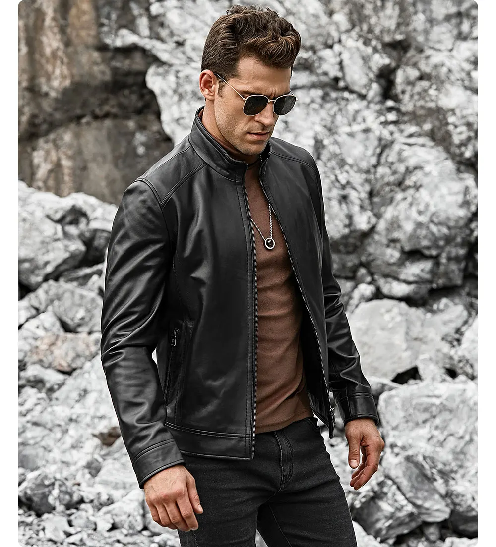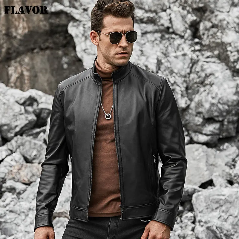 Kожаная куртка мужская FLAVOR, черный жакет из натуральной овечьей кожи, с воротником стойка, приталенный силуэт, теплая байкерская куртка, кожаный пиджак на весну-осень 2019