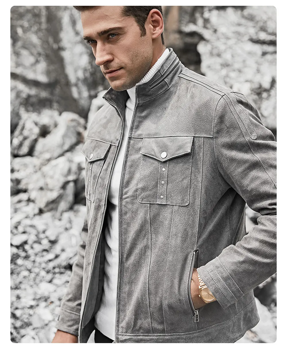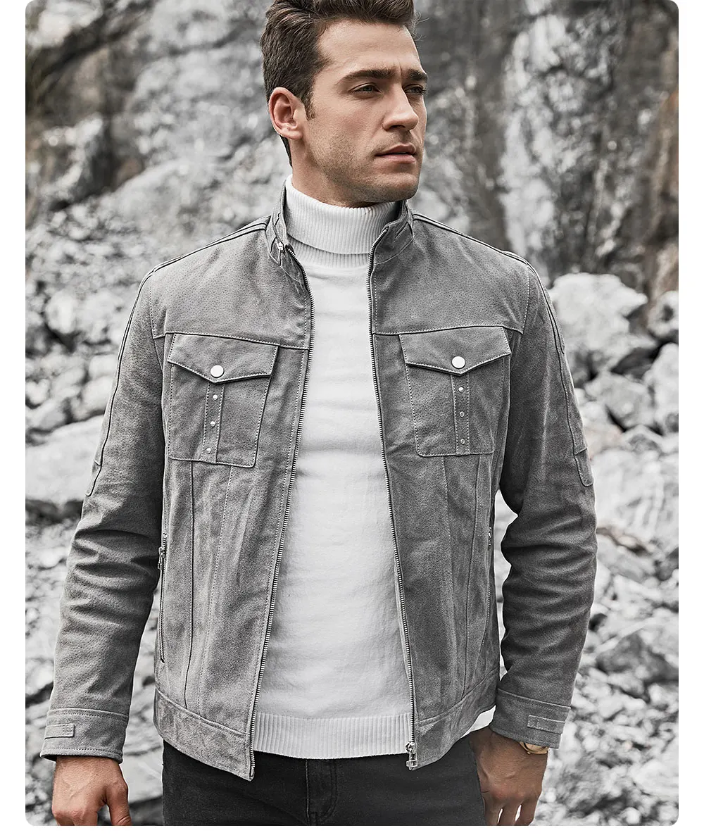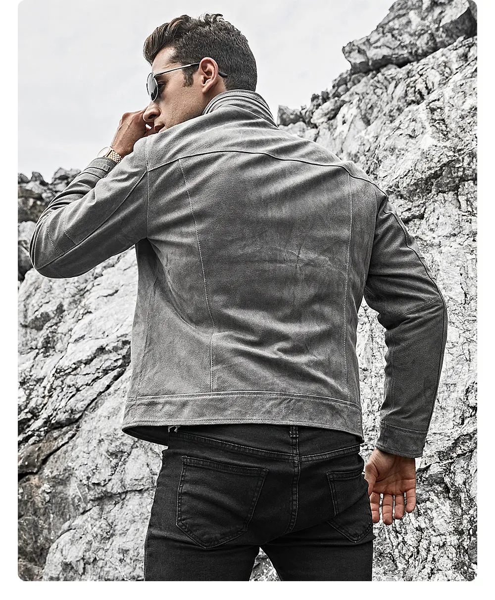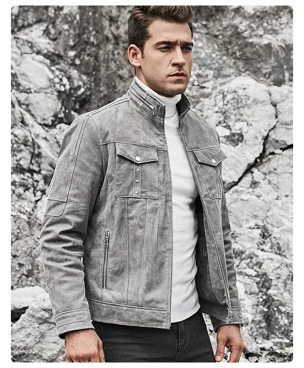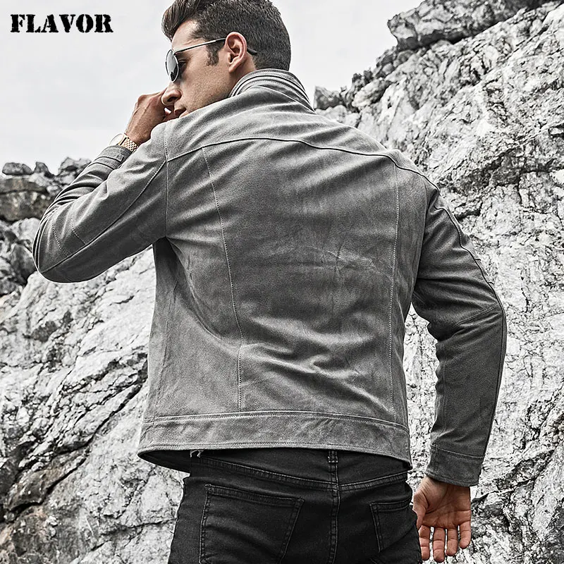 Мужская кожаная куртка FLAVOR, серая байкерская куртка из свиной шкуры с воротником-стойкой